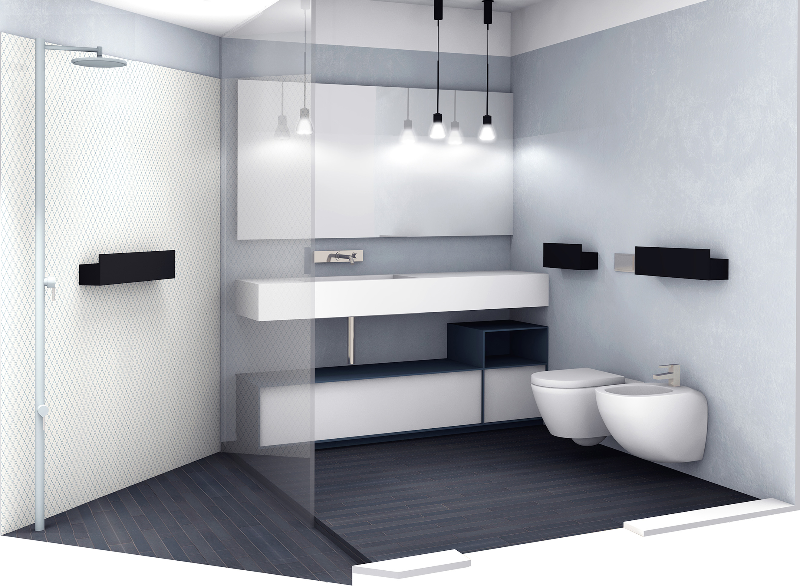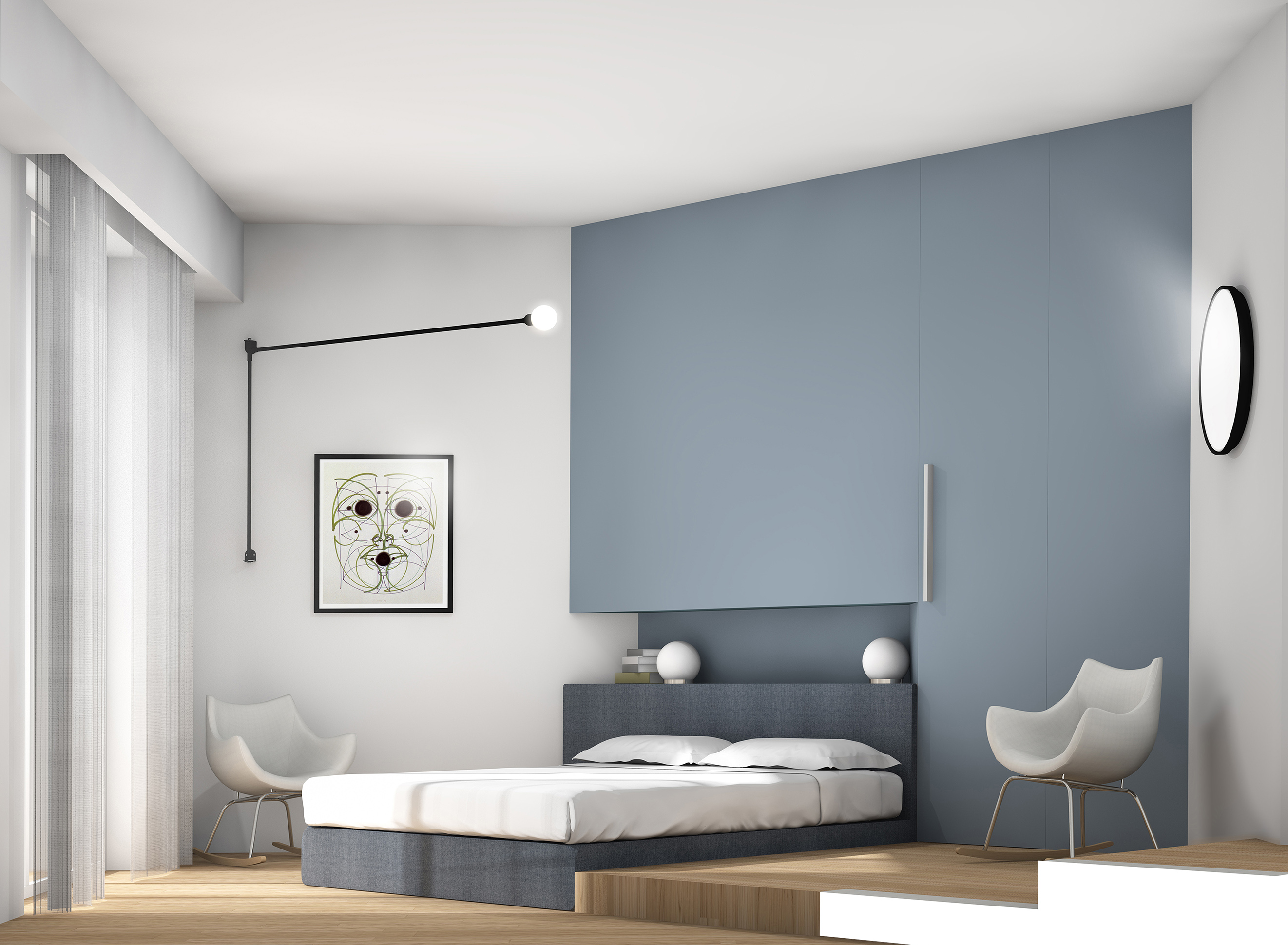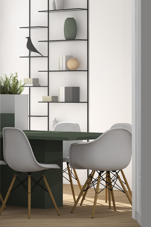 The apartment is located at the fifth floor of a 60’s high-quality building and is characterized by an interesting distribution system dating back to a project from the 80’s, distinguished by the use of diagonal walls, steps and platforms as connection between spaces. The project maintains this original distribution system but renovates it completely in materials and finishes, so as to be more in line with the tastes and life-style of the clients: a young couple with a child.