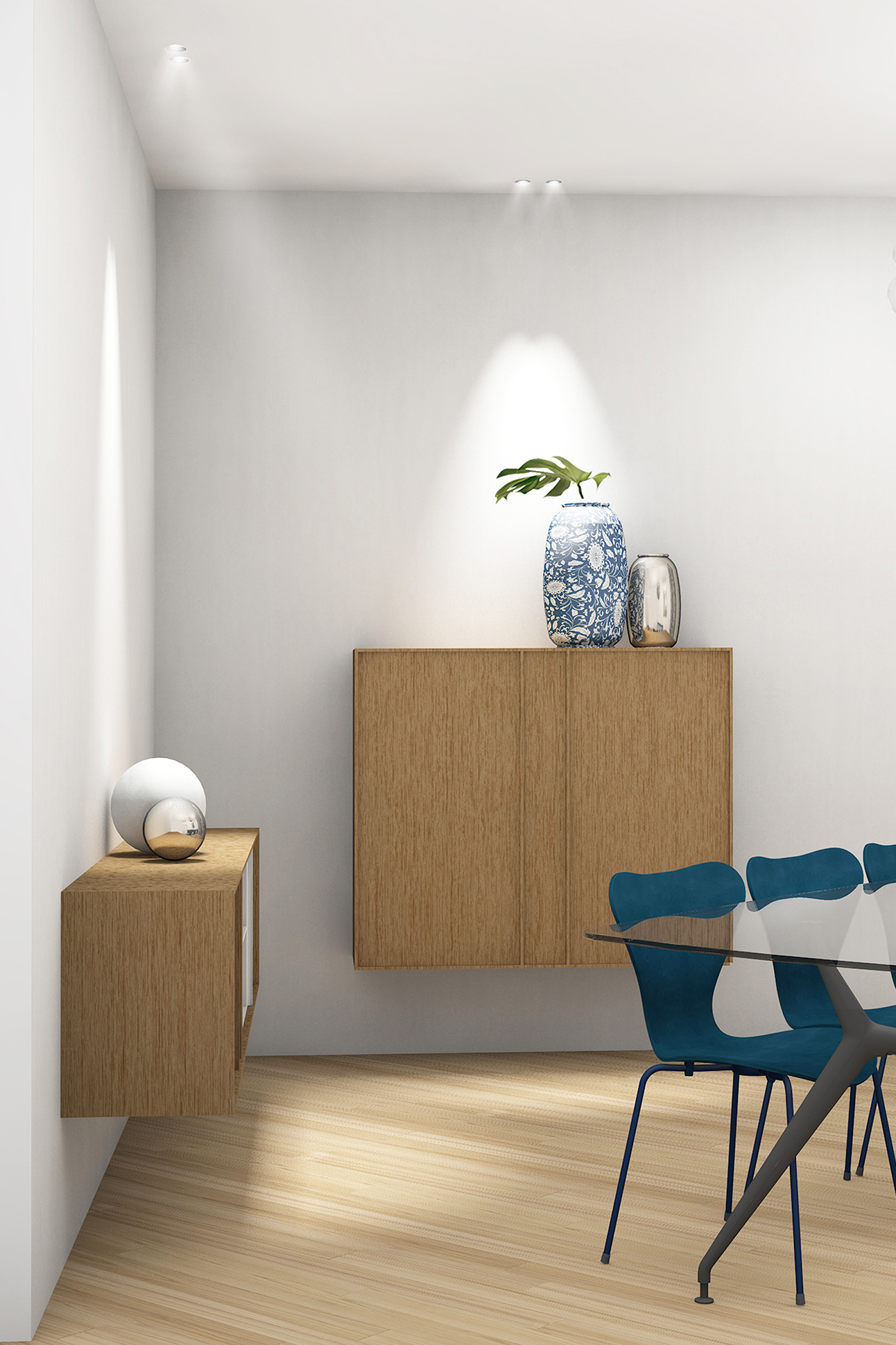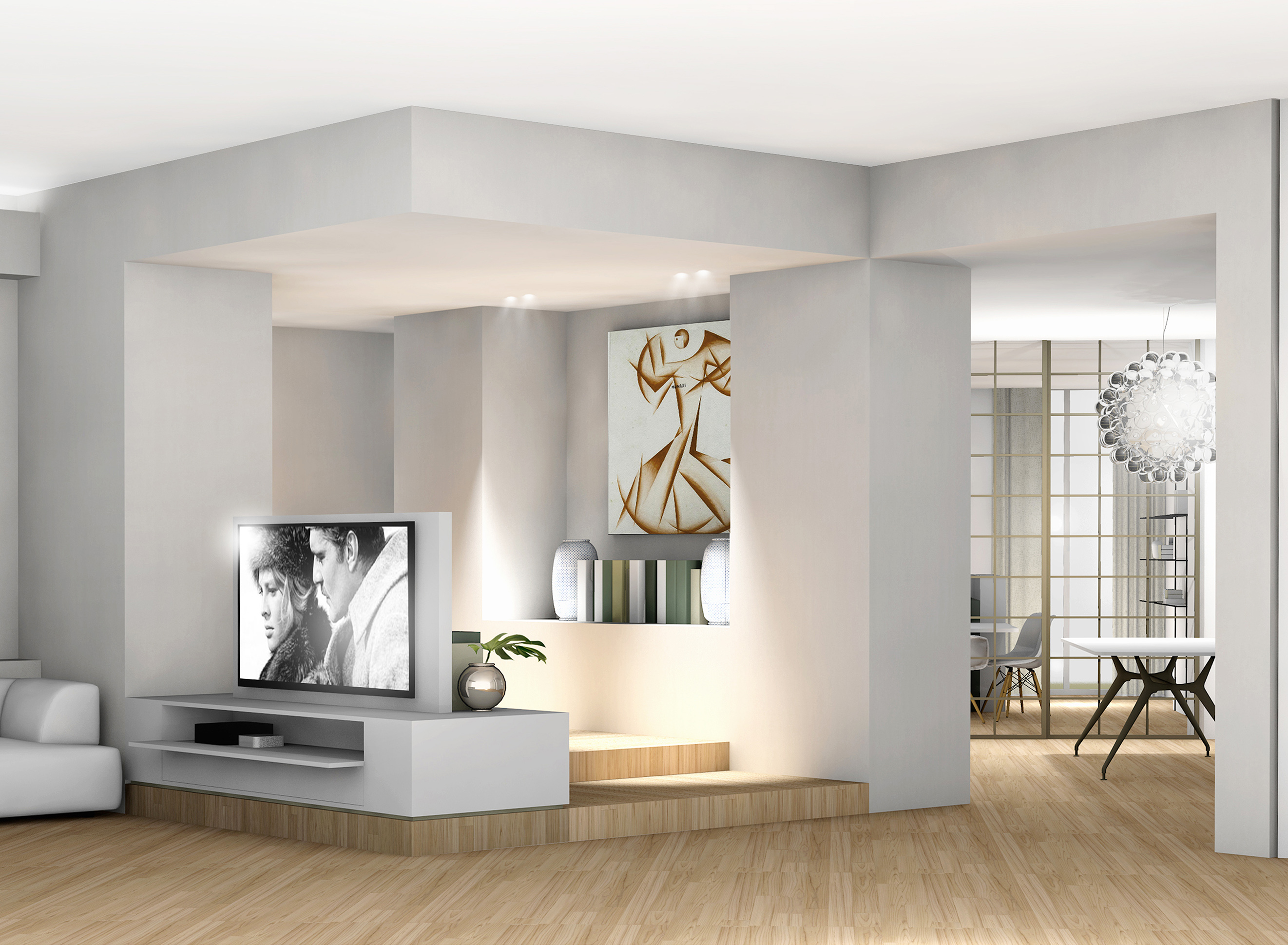 L’intervento architettonico ha visto una maggior apertura della zona cucina che diventa cosi il fulcro della casa, direttamente collegata tramite una grande vetrata scorrevole alle zone pranzo e soggiorno. Si crea così un cannocchiale visivo che attraversa interamente l ‘appartamento collegando i due terrazzi alle estremità, consentendo alla luce naturale di invadere gli spazi durante il corso dell’intera giornata.