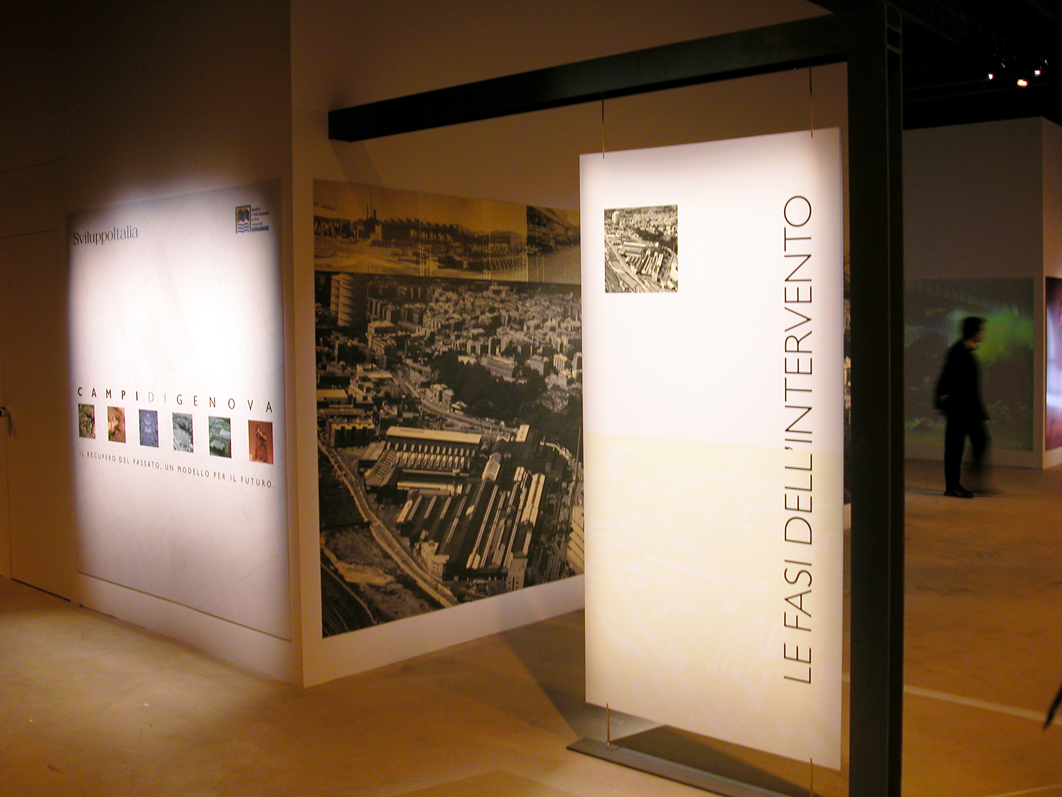 The project originated from the need to communicate to stakeholders and the general public the reconversion of the Campi area in Genoa, following the closure of the industrial steel-working plants which worked up to the ‘80’s. The most adequate communication tool to describe the reconversion project was a city event hosted within the area itself, centred on a photographic exhibition, documenting all the phases and presenting to investors the development potential of the area. The exhibition integrated photographs, texts and appositely produced videos with numbers of the reconversion.