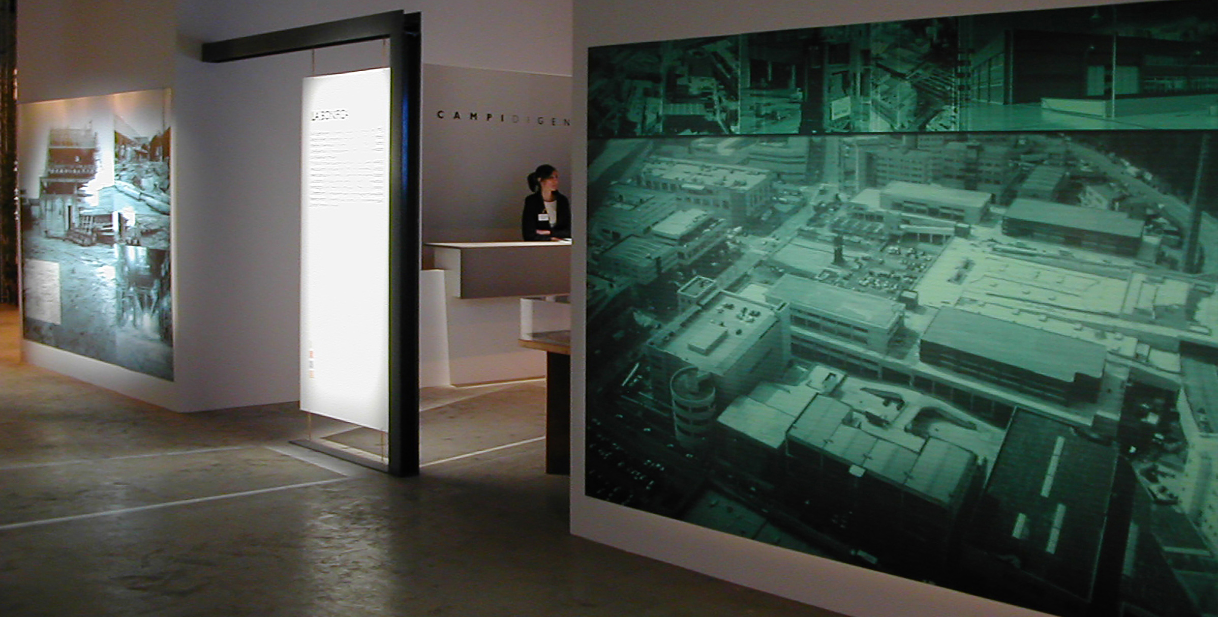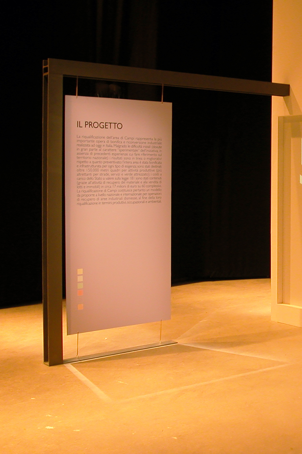Il progetto nasce dall’esigenza di comunicare in modo forte ed incisivo il mutamento in corso su un’ampia area del quartiere di Campi a Genova con la dismissione degli impianti industriali siderurgici che vi sorgevano fino agli anni ottanta. L’idea di proporre una mostra fotografica che evidenziasse le varie fasi di tale mutamento proprio all’interno di uno degli edifici riconvertiti è sembrata lo strumento di comunicazione più indicato per sensibilizzare opinione pubblica ed investitori sulle potenzialità dell’area. La mostra integrava fotografie, testi e filmati appositamente prodotti per documentare i dati dell’operazione.