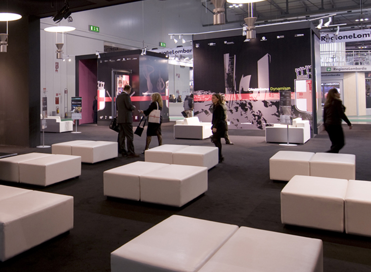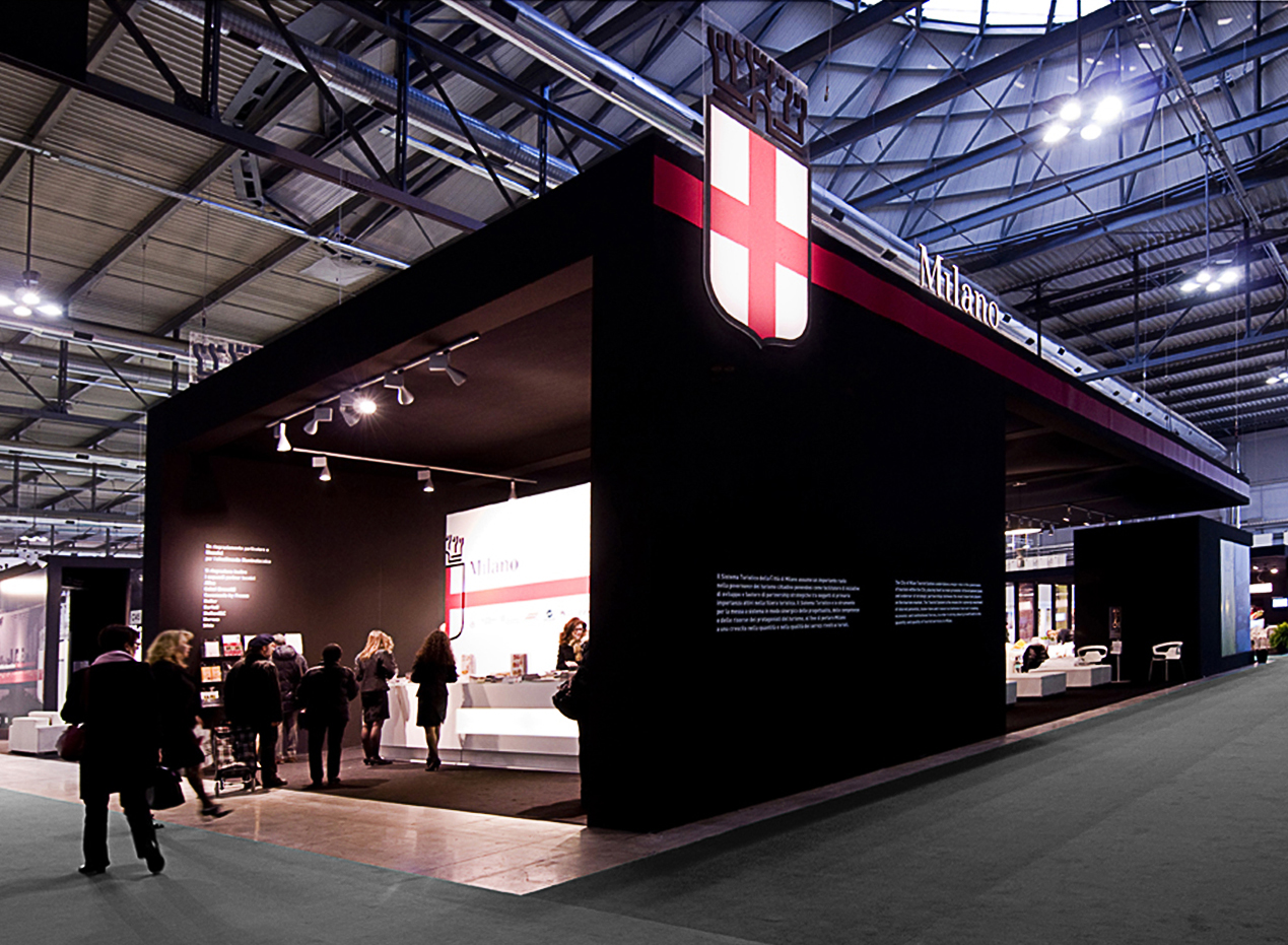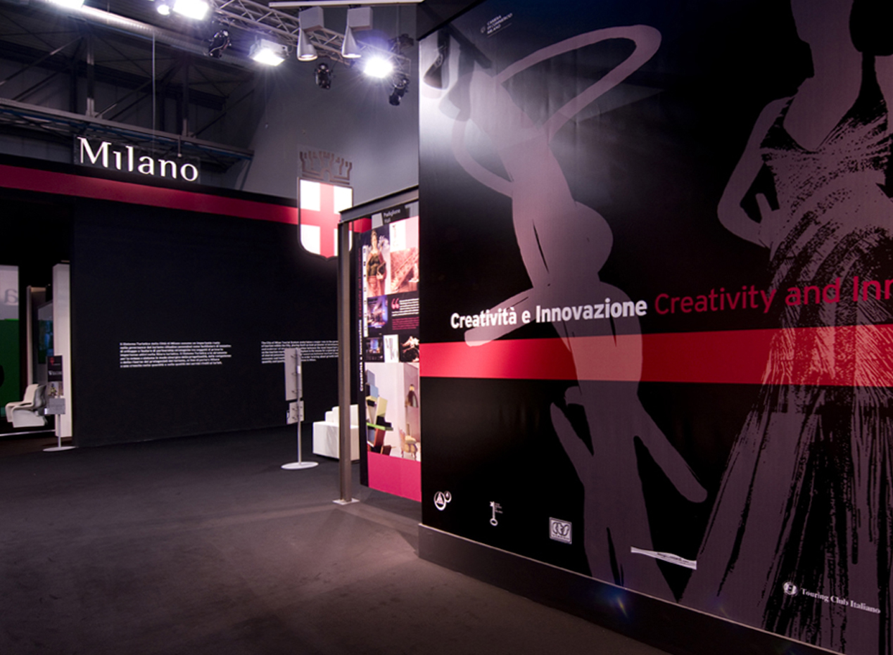 The stand for the Comune di Milano at the 2009 BIT was to show the many excellent attributes of Milan, through a high quality presentation linked to aesthetics, technology and organization. For such motives it was decided to organize a 1000 sq.mt stand on the excellence of the city, proposing an in-depth look through the language of aesthetics, art, technology, and organization, all of which are embedded in the Milanese environment. A journey through art, materials, designs and real operations in a continuous dialogue highlighting the inventiveness of the Milanese coupled with their functionality.