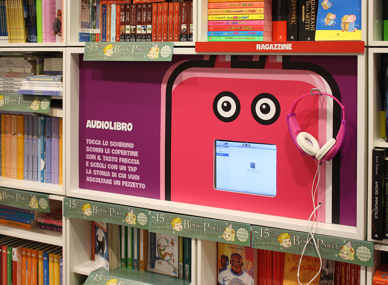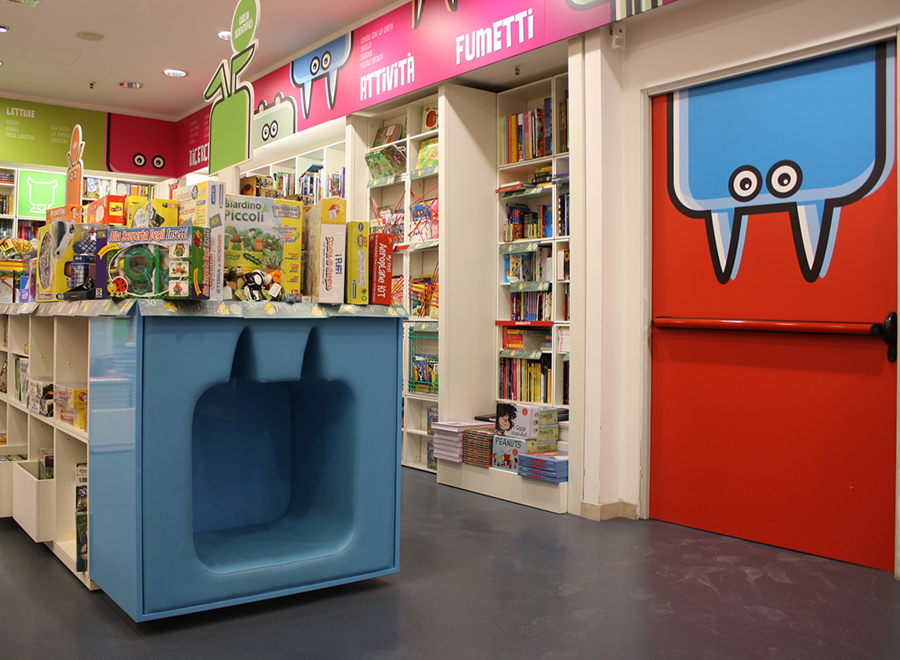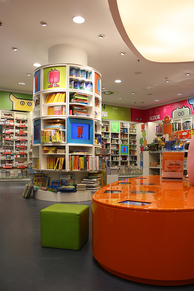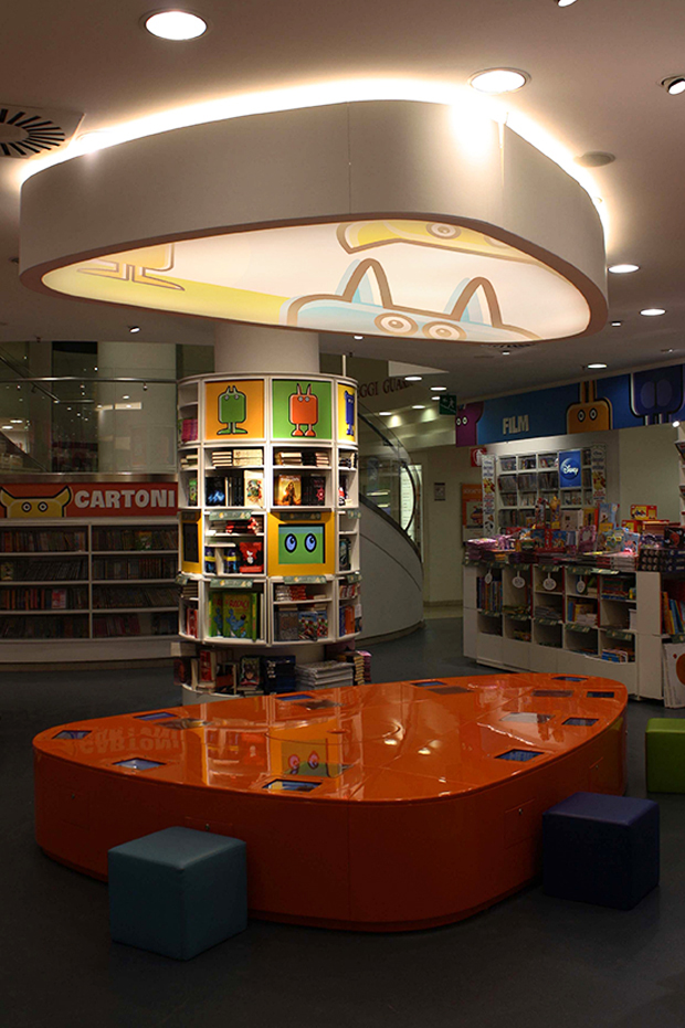 MOBI (Mondadori Bimbo) is a pilot project for children spaces in Mondadori bookshops. It is an integrated interior design, communication and didactic multimedia project, developed by Gruppo Bandello and MUBA – Children Museum of Milan. It is a playful and colourful space, designed to bring children and their families close to the world of reading with innovation and multimedia.