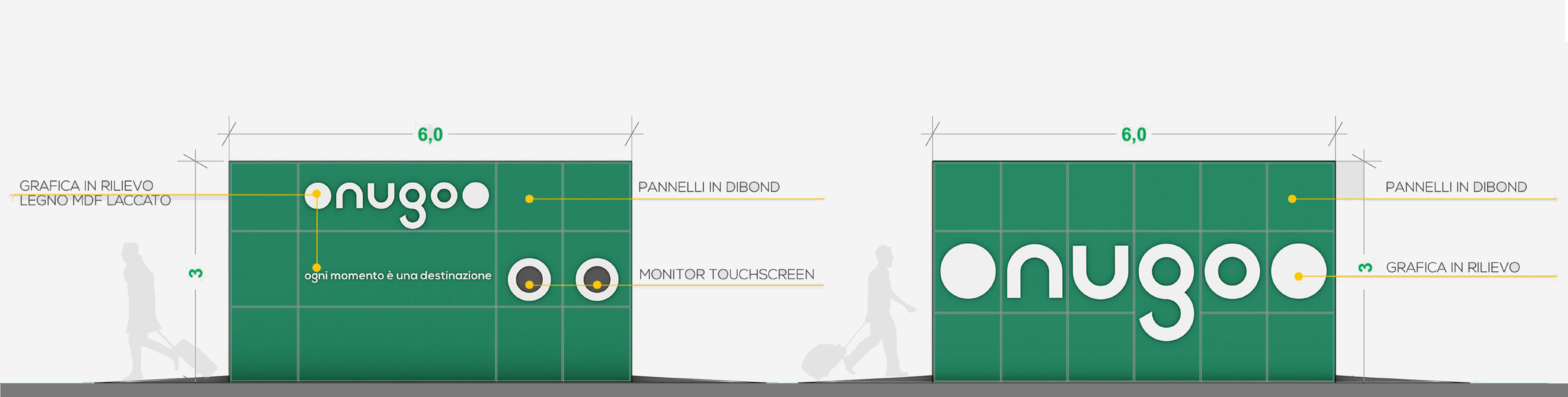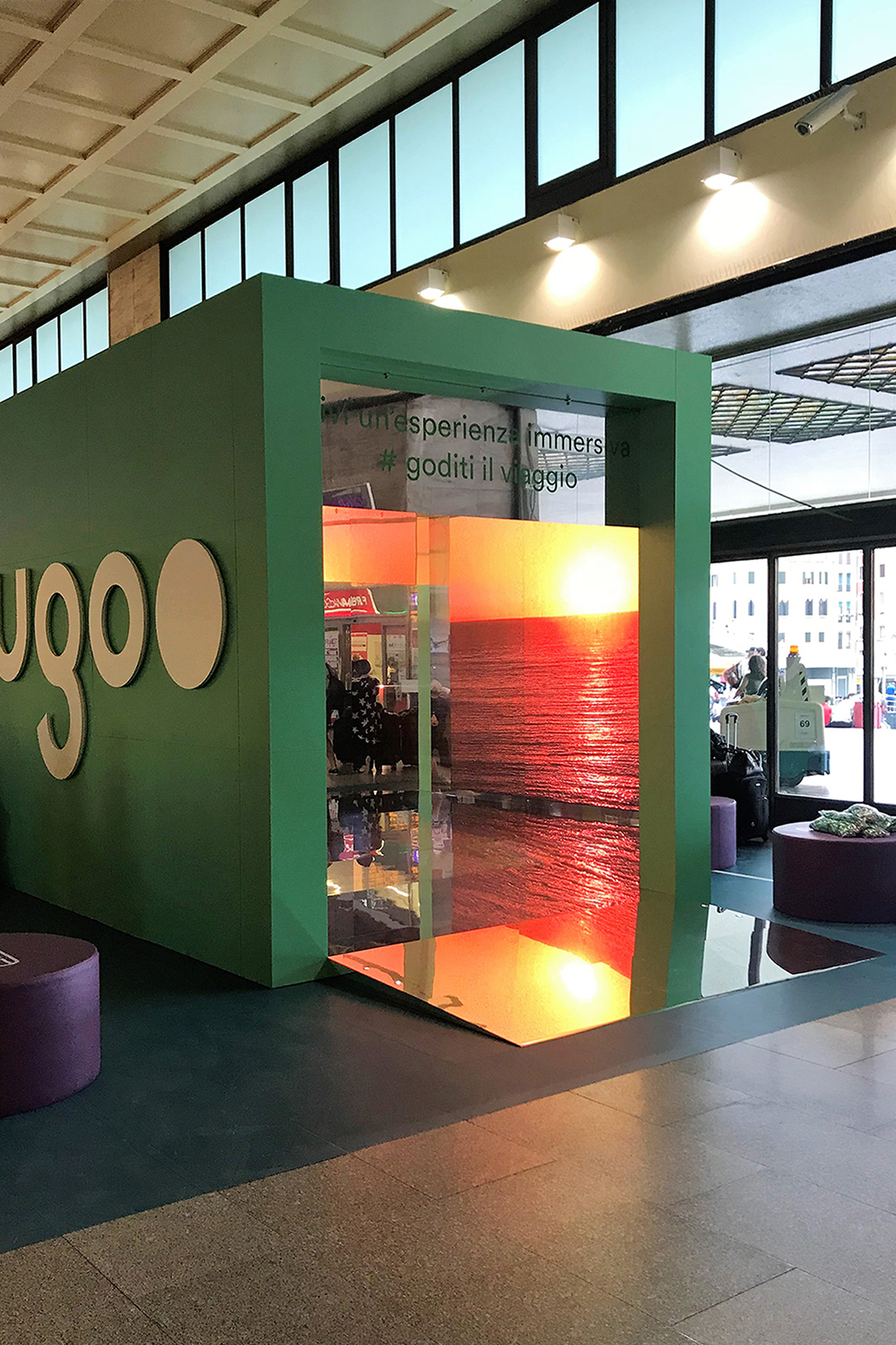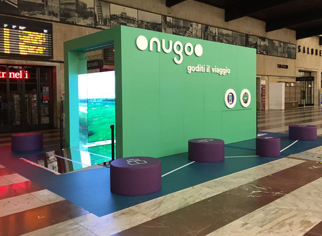 E’ il lancio di una piattaforma intermodale tra reti ferroviarie, taxi, aerei, trasporto pubblico, car/bike/ scooter sharing, hotel ecc., attraverso un’esperienza di mobilità integrata reale e rilevante. Il progetto si compone di un volume centrale passante inserito in una “piazzetta” attrezzata con sedute e schermi touchscreen. Esternamente il volume è caratterizzato dai valori del brand (colore, logo, "look and feel"), mentre internamente è caratterizzato dall’esperienza immersiva nel viaggio NUGO. Il volume passante è un tunnel aperto sui due lati corti in modo da consentire un flusso continuo di visitatori. Internamente presenta una esperienza immersiva consentita da un sistema di proiezioni e specchi che crea l’illusione dell’infinity mirror.