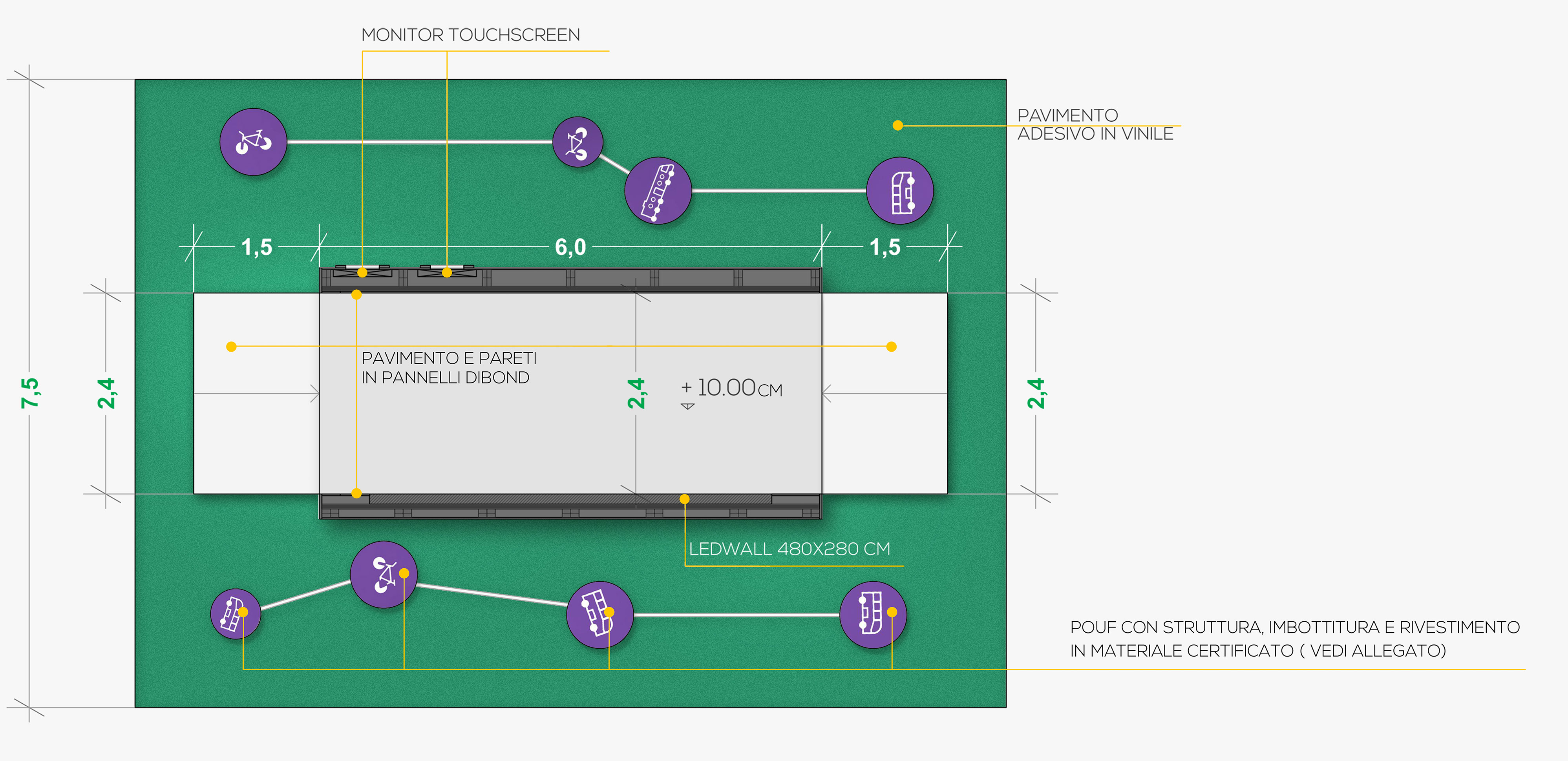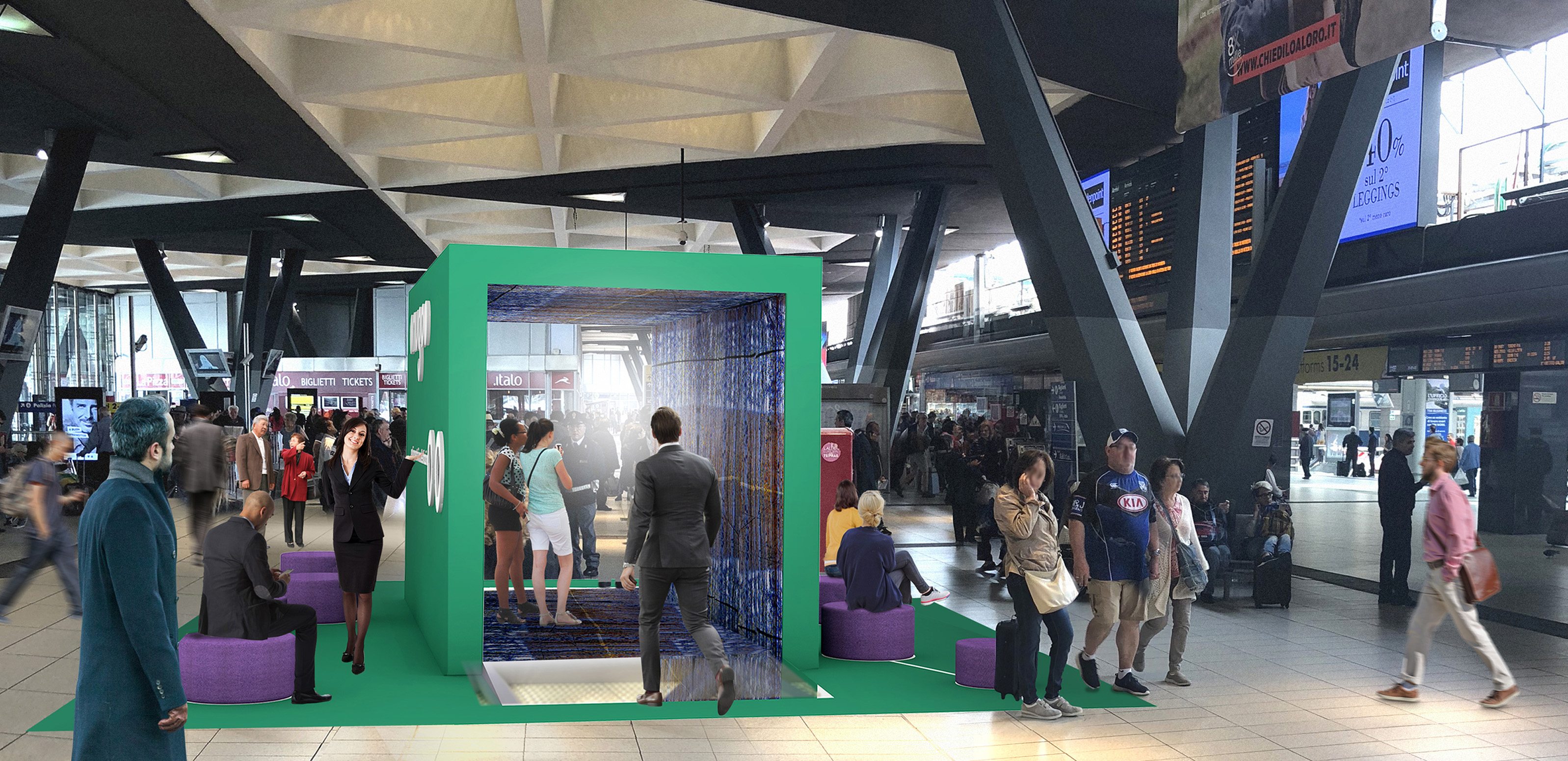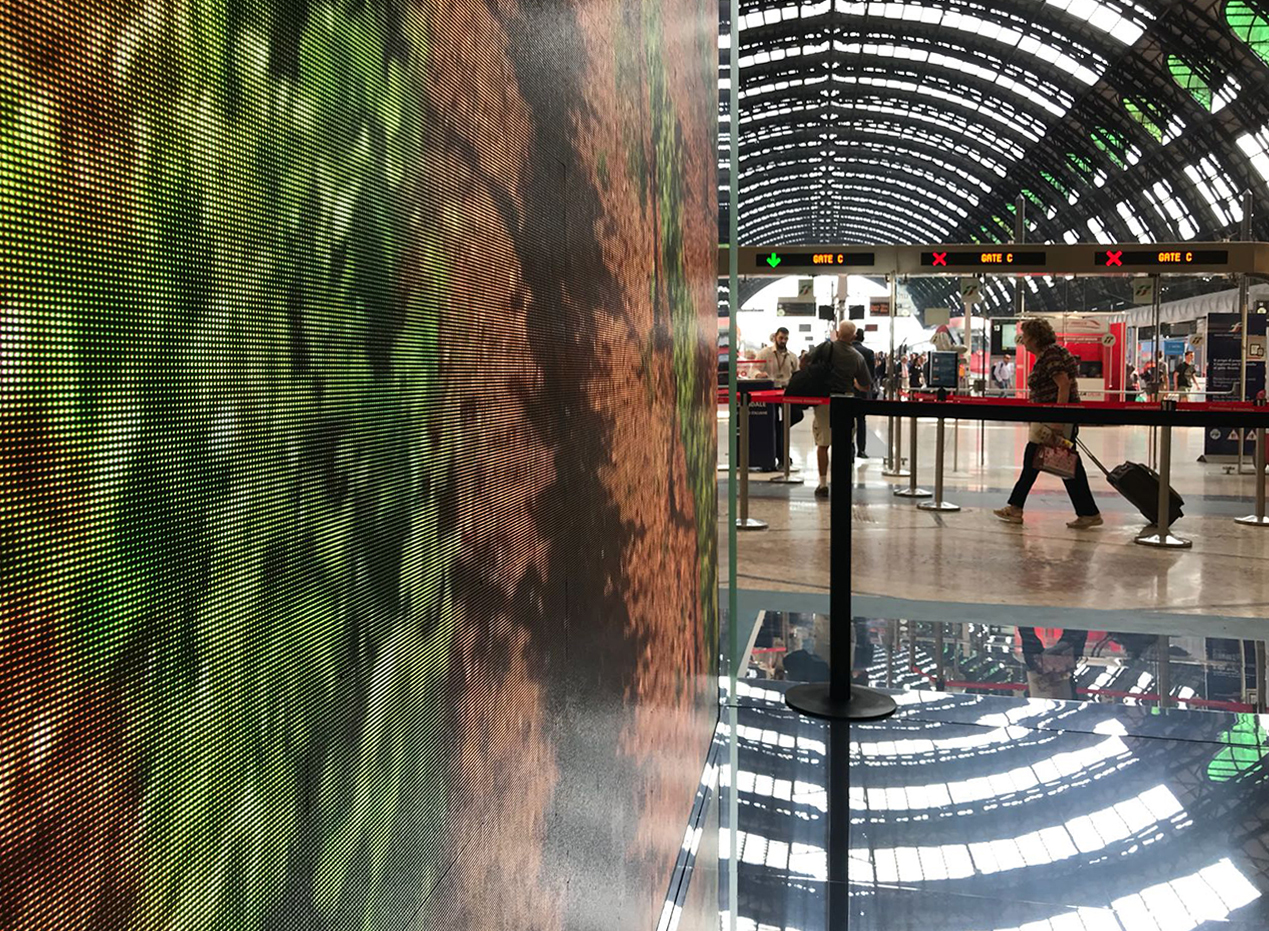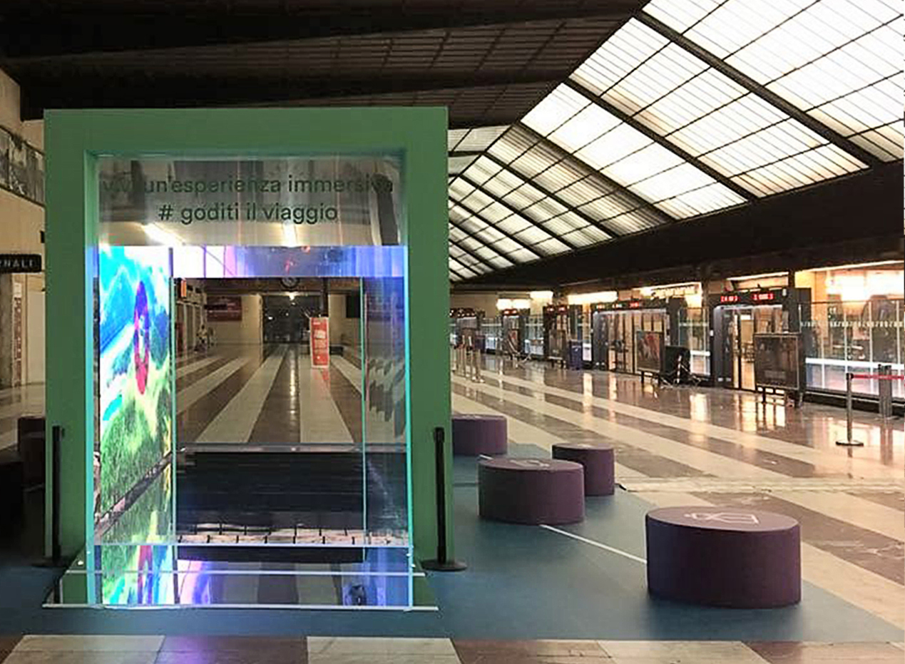 It is the launch of a new intermodal hub connecting rail networks, taxis ,airplanes, public transport, car/bike and scooter sharing, hotels etc. through a real and relevant mobility experience. The project consists of a central cross-through volume fitted into a “plaza” equipped with seats and touch-screens. On the outside the volume is characterized by the brand values (colour, logo, look and feel), while inside it combines the immersive experience of the NUGO journey. The cross- through volume is a gallery, open on both short sides so as to allow visitors to walk across its length. Inside it allows an immersive experience thanks to a set of reflecting videos, creating the illusion of an infinity mirror.