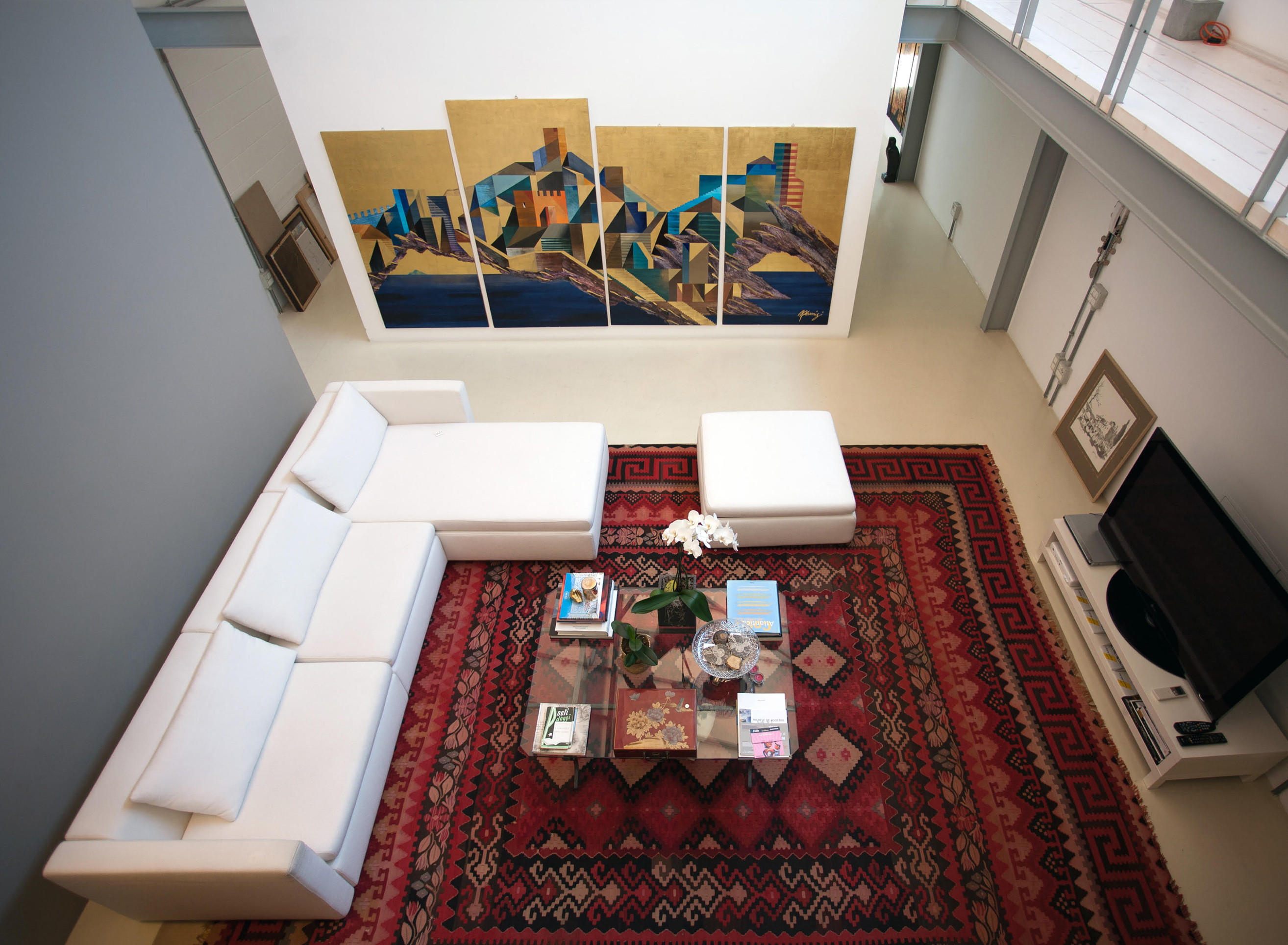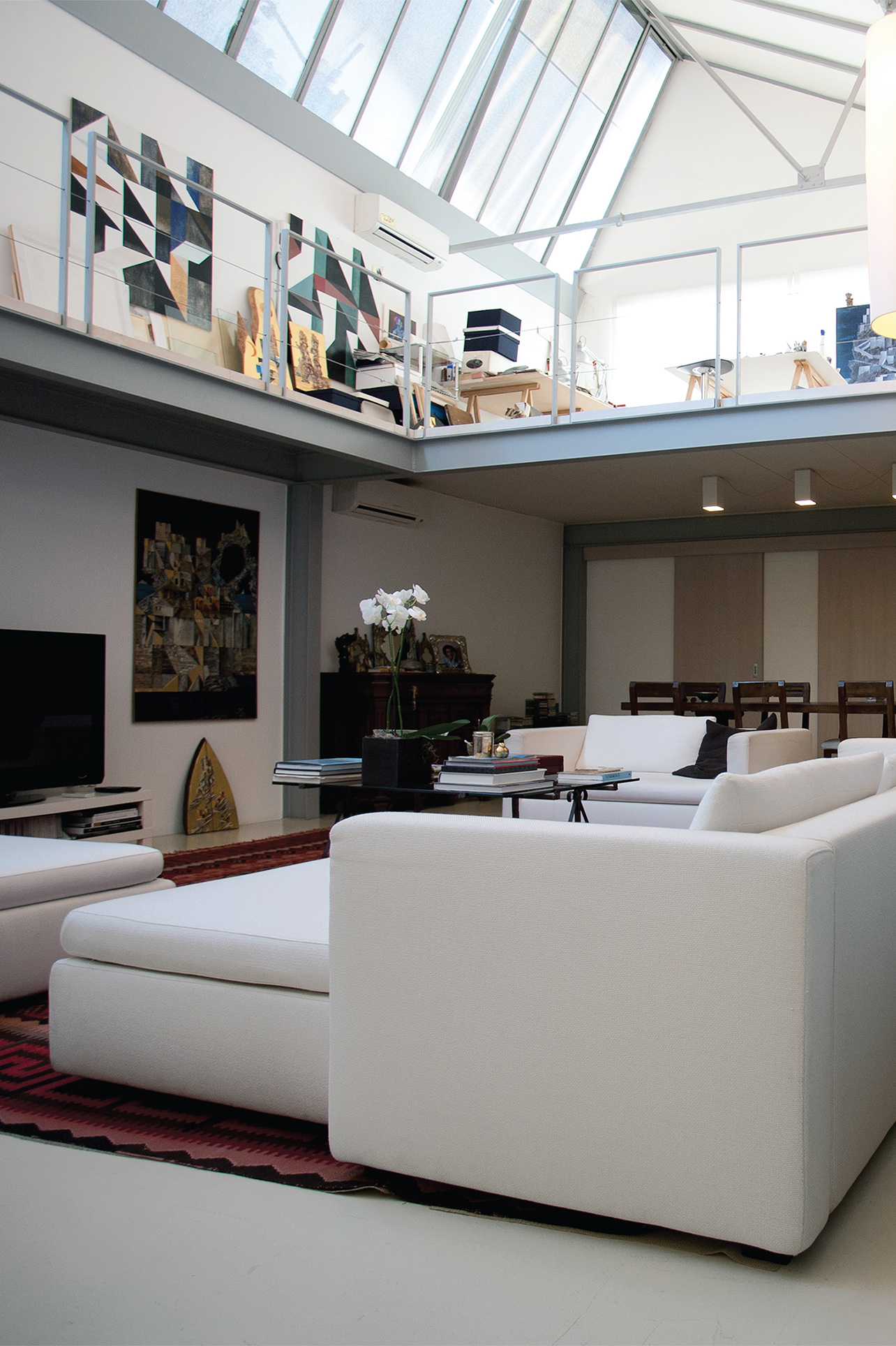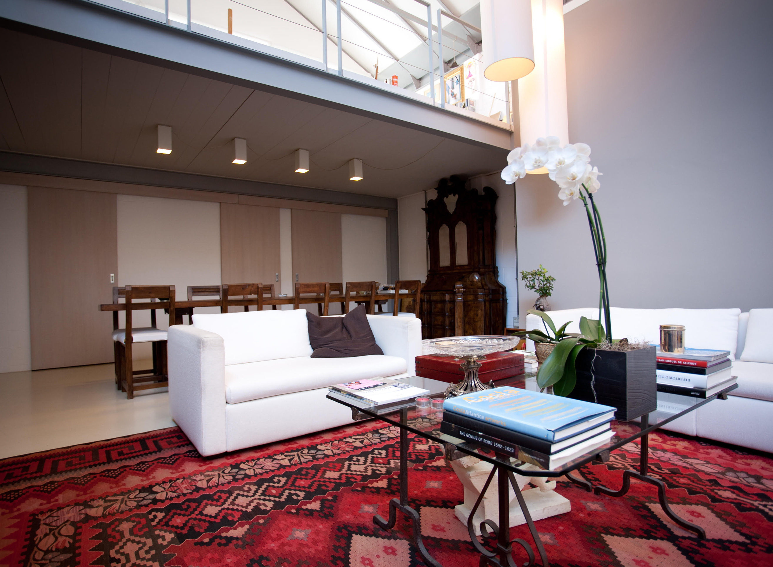 Un loft composto da un ampio piano terreno e da un soppalco con piccolo terrazzo fiorito, per ospitare la vita e il lavoro di un artista. Pur se in fluida continuità di spazio e di vita, il piano inferiore è quello della vita, il piano soppalco quello dello studio e del lavoro.