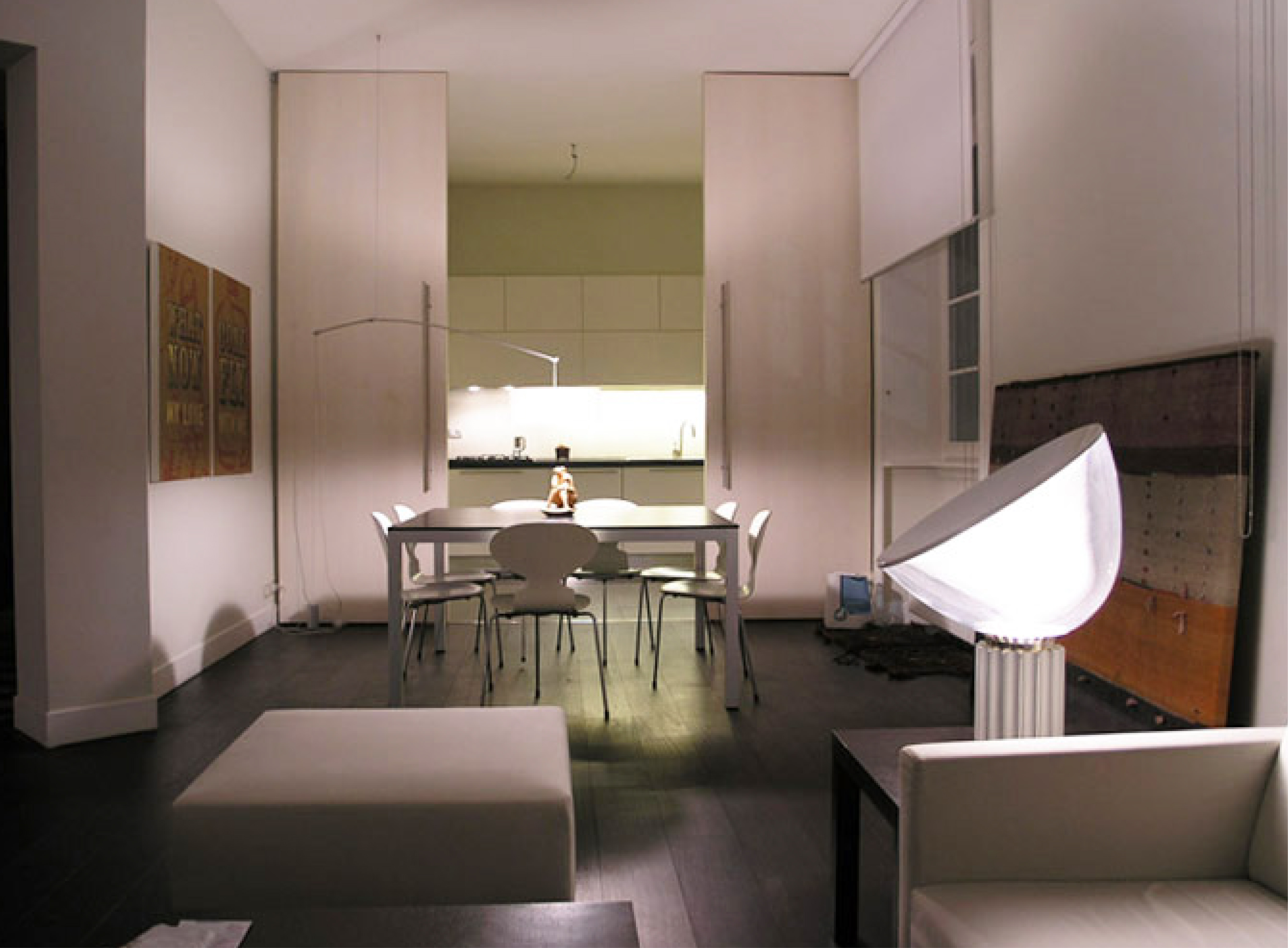 The interior design combines two living units in an effort to retain the strong character of the existing morphology. The resulting space is an L -shaped 150 sq. mt. flat, full of light and characterized by a marked chromatic dichotomy between clear and dark tones. The entrance opens into the corner living room, the pivot of the entire apartment, at its sides, the kitchen and the studio/guest room, and two separate bedroom areas. All walls are kept neutral apart from an important dash of colour where a collection of paintings is hung on a red surface. Floors are in dark wenge wood parquet, laid with long wide staves.