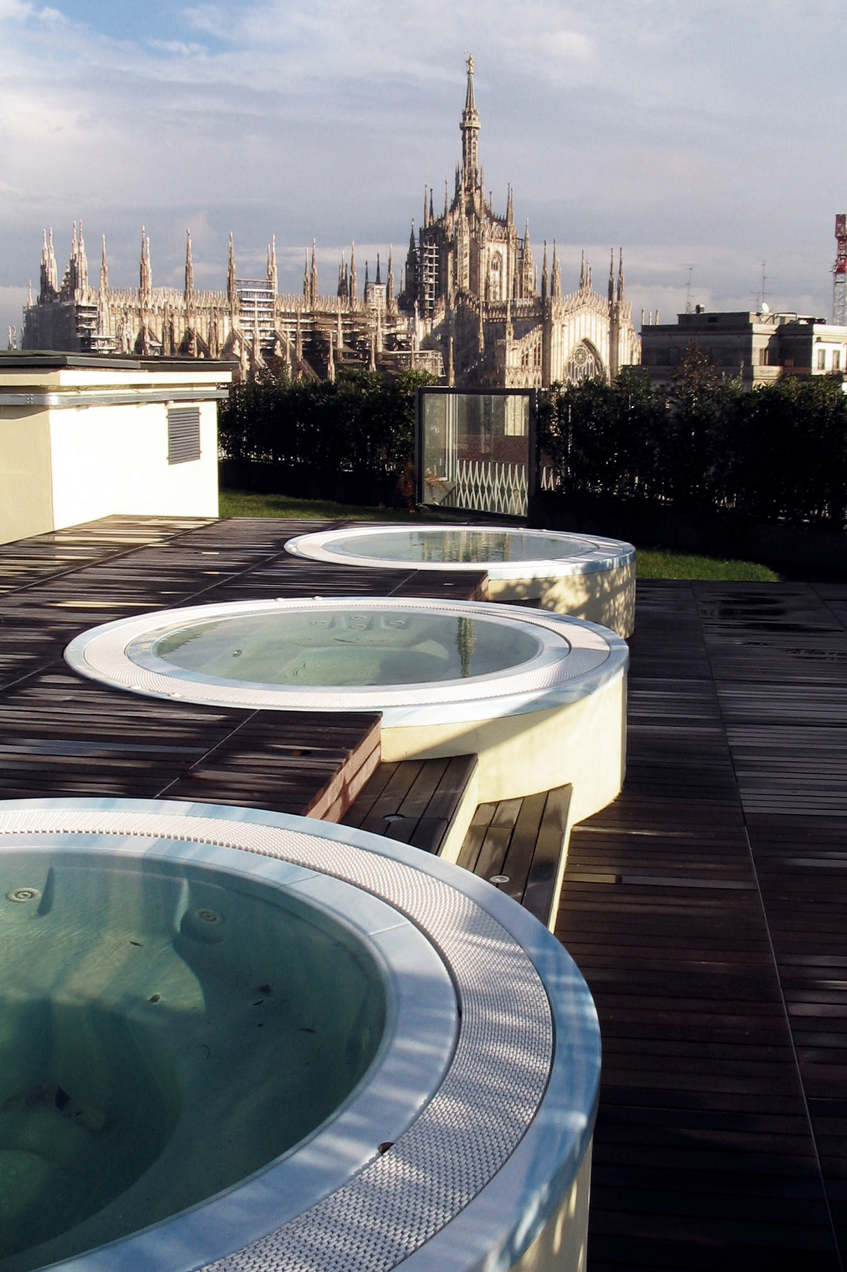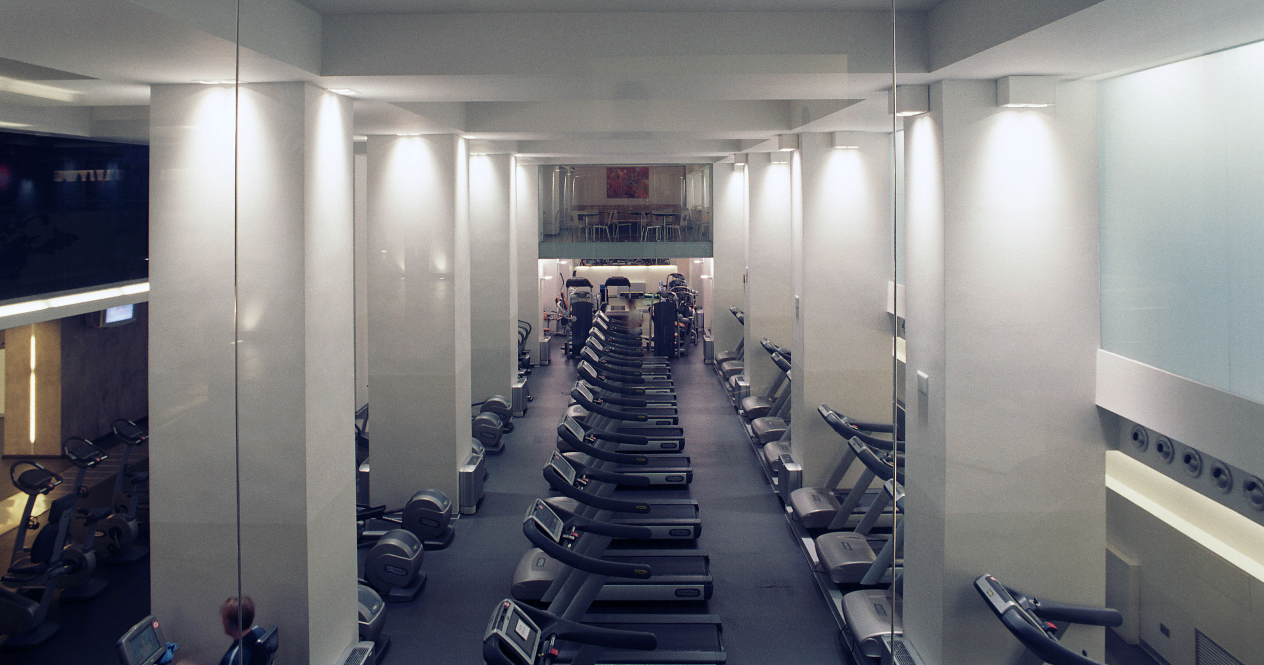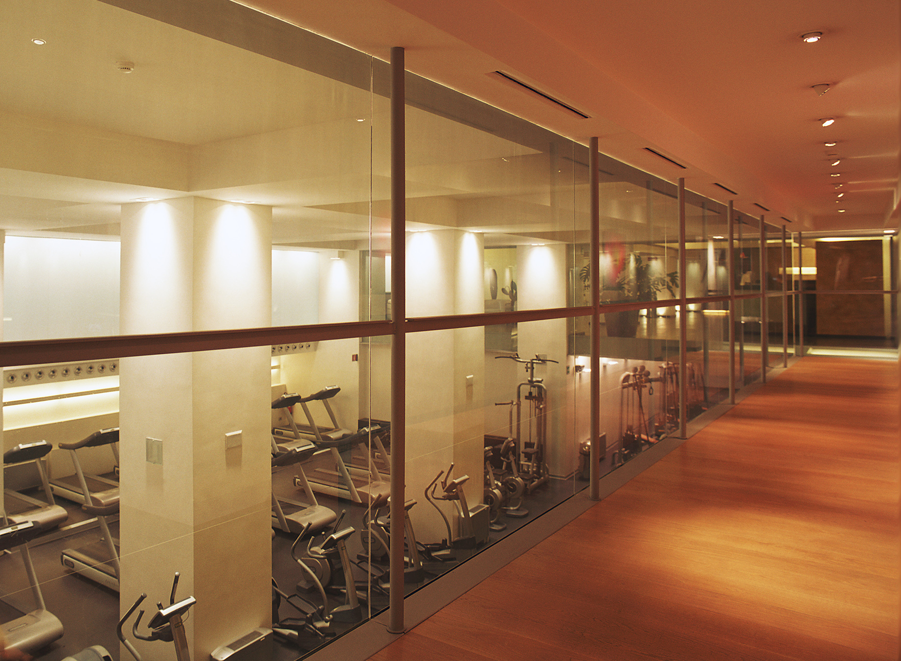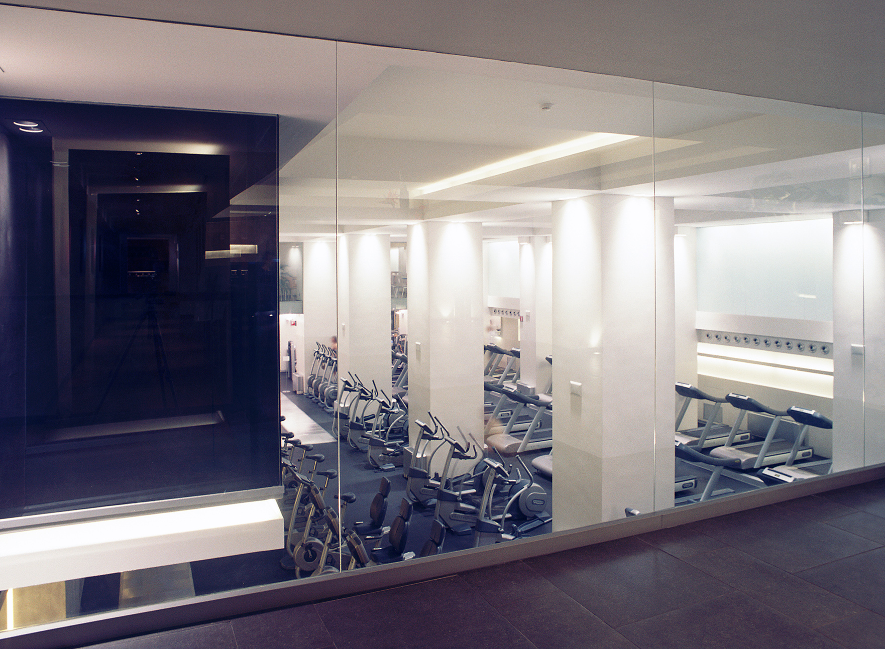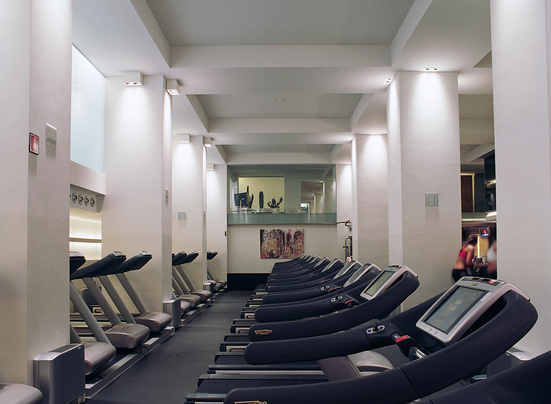 The object of this project were the first and second level basement floors of a historical building in Piazza Diaz in Milan, amounting to a total area of around 4000 sq.mt. The top floor of the building hosted a solarium terrace plus 300 sq.mt. of garden with sun beds, showers, hydro-massage baths, a bar and a restaurant, all accessible directly from the gym by a panoramic lift. The entrance from the street was a glass door revealing nothing of the interior, which was reached by a Corten steel staircase. The second basement floor hosted the entire fitness area, subdivided into various areas: cardio, spinning, boxing, free movement, personal training, running room, and male and female changing rooms. All of these functions were positioned around a bright and airy central court of double height, all in glass, and the true heart of the design. Located on the first basement floor there were the reception, offices, a multi-purpose room, the restaurant-bar, male and female thermal areas and a separate training room with its own changing room.
