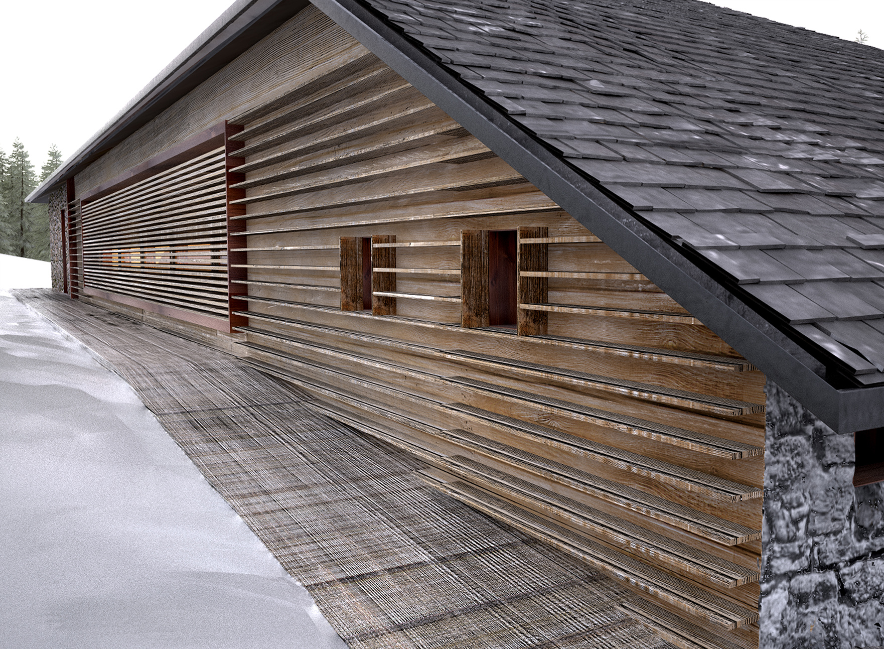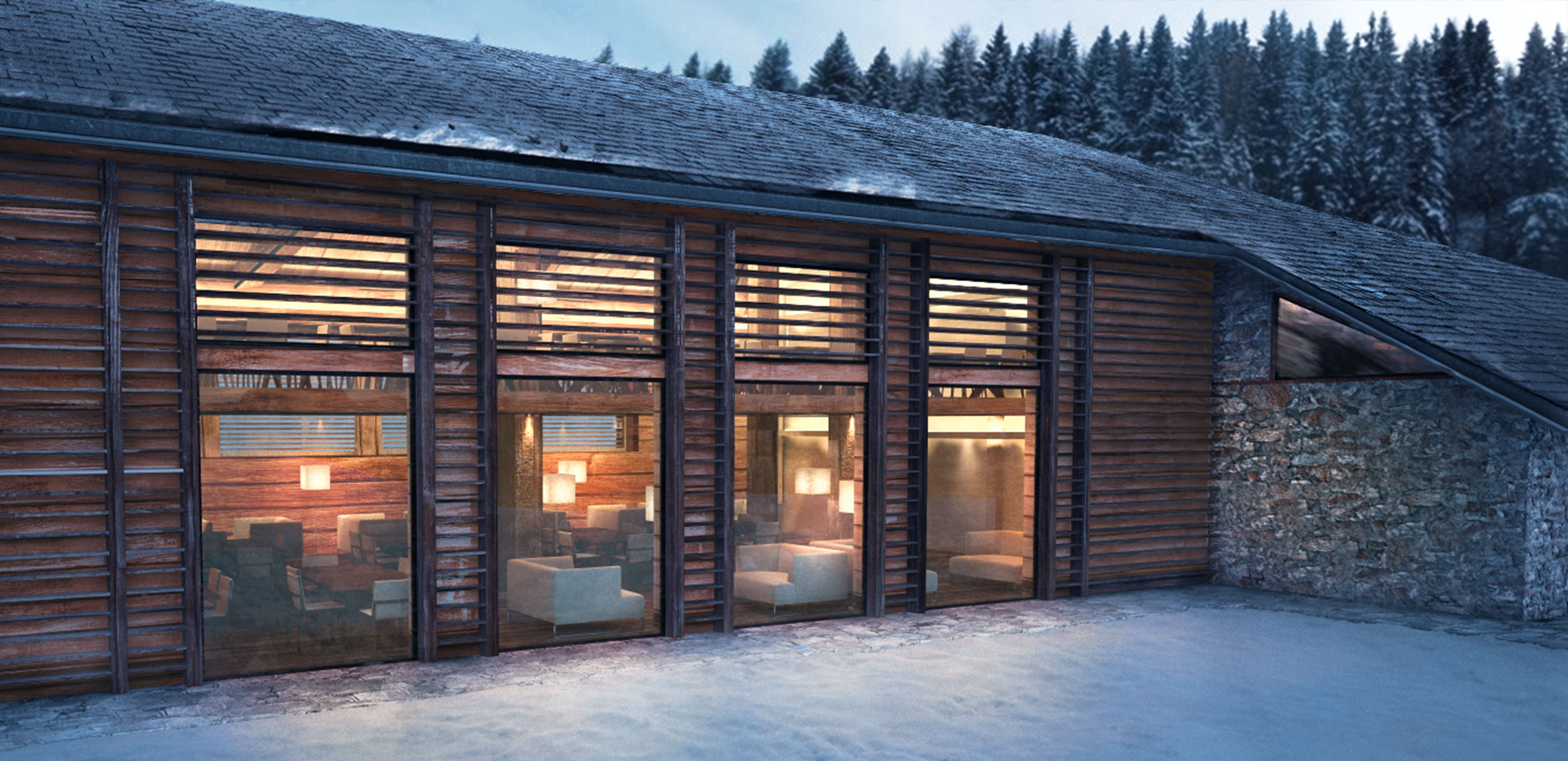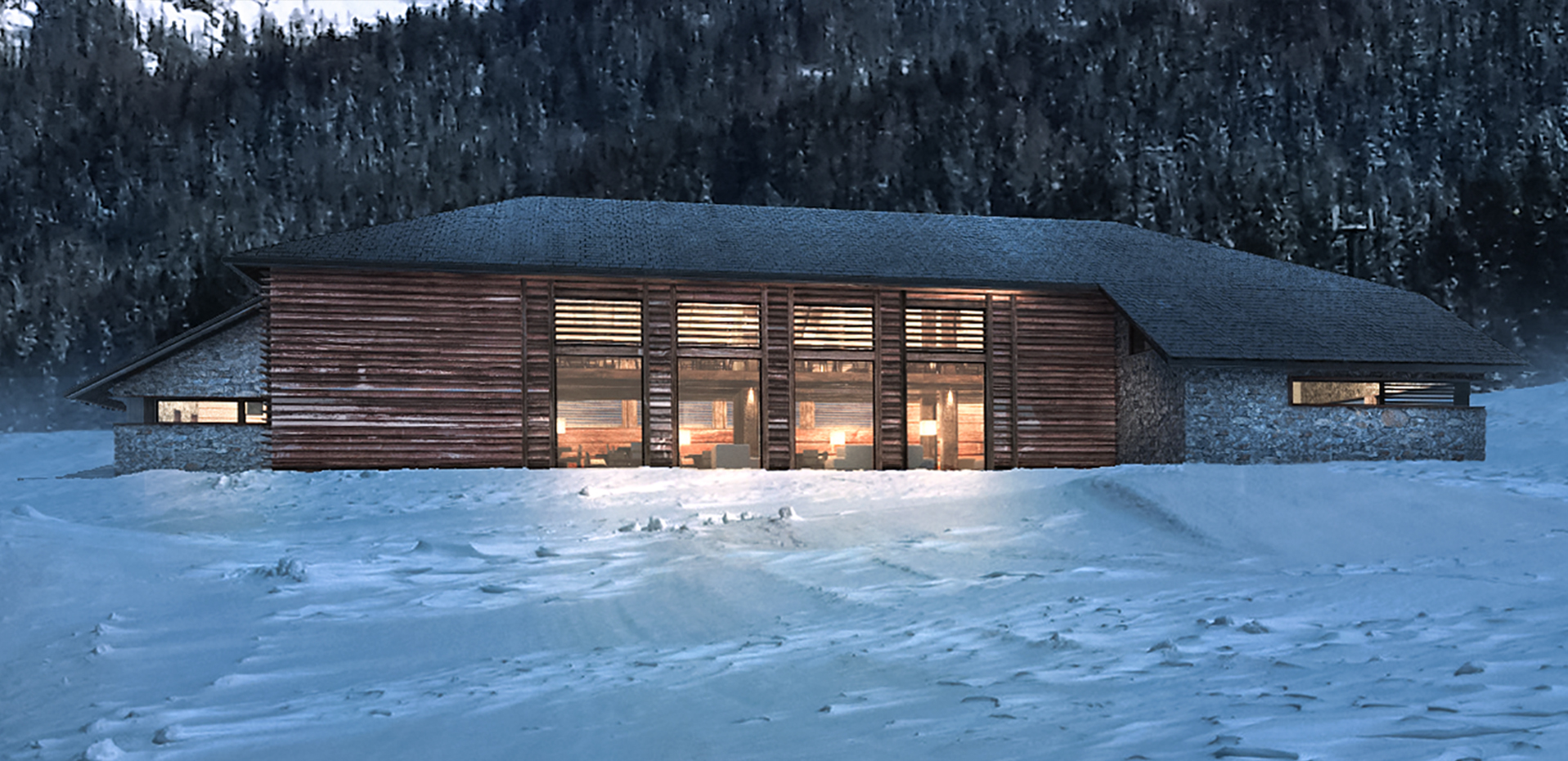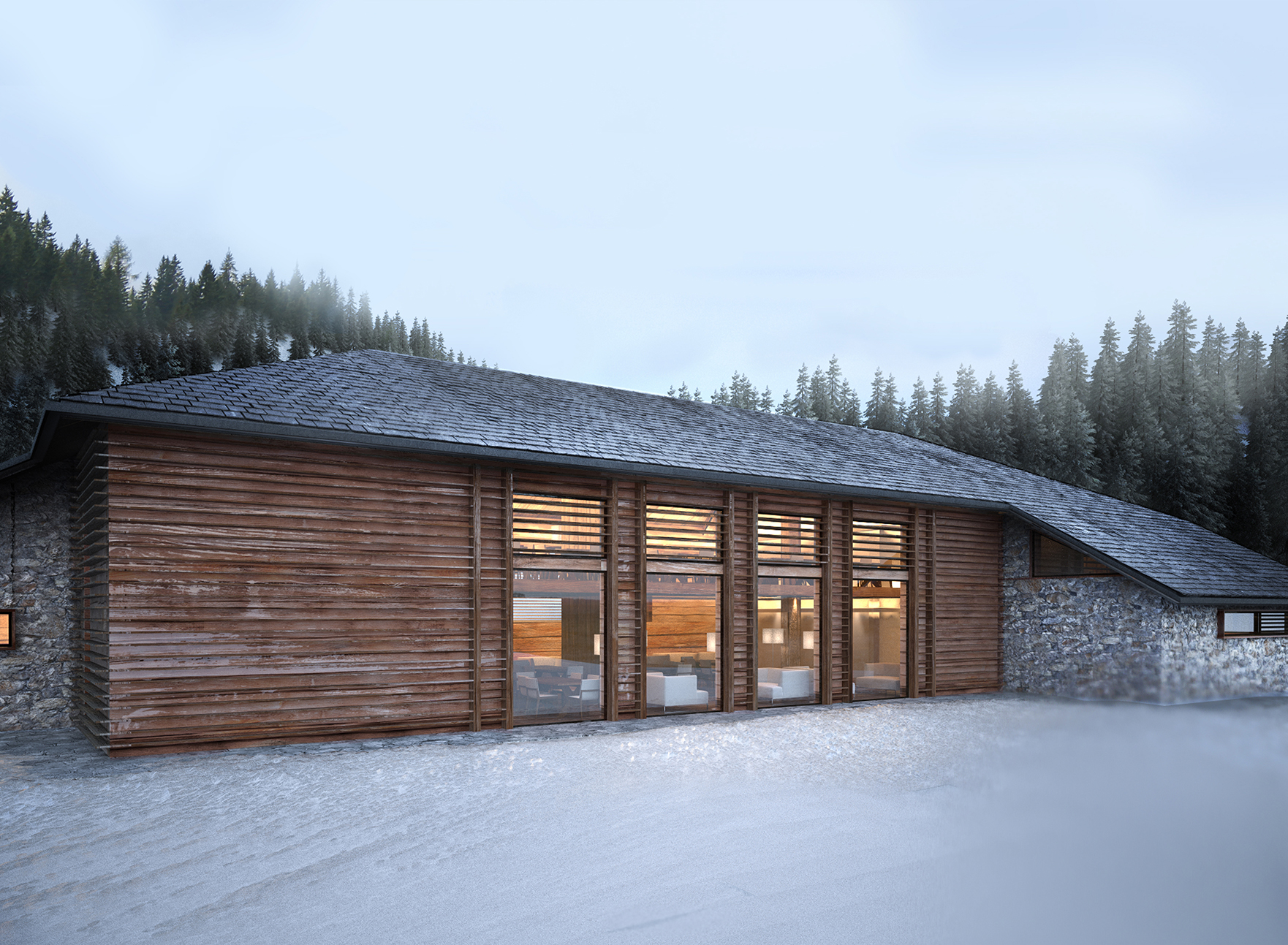 Reconstruction and redevelopment project of the mountain cottage in Campo Carlo Magno, used as accommodation and connected with the existing Golf Hotel structure. The design composition of the façade is characterized by succession of volumes covered by recycled stone and wood. The wooden boards are laid with an alternate texture, inspired by the modernistic walls and the horizontal textures of the blockbau structures. The main façade composition is characterized by the alternation between wooden-framed full height openings and vertical partitions, in order to recall the buttresses of the original construction.