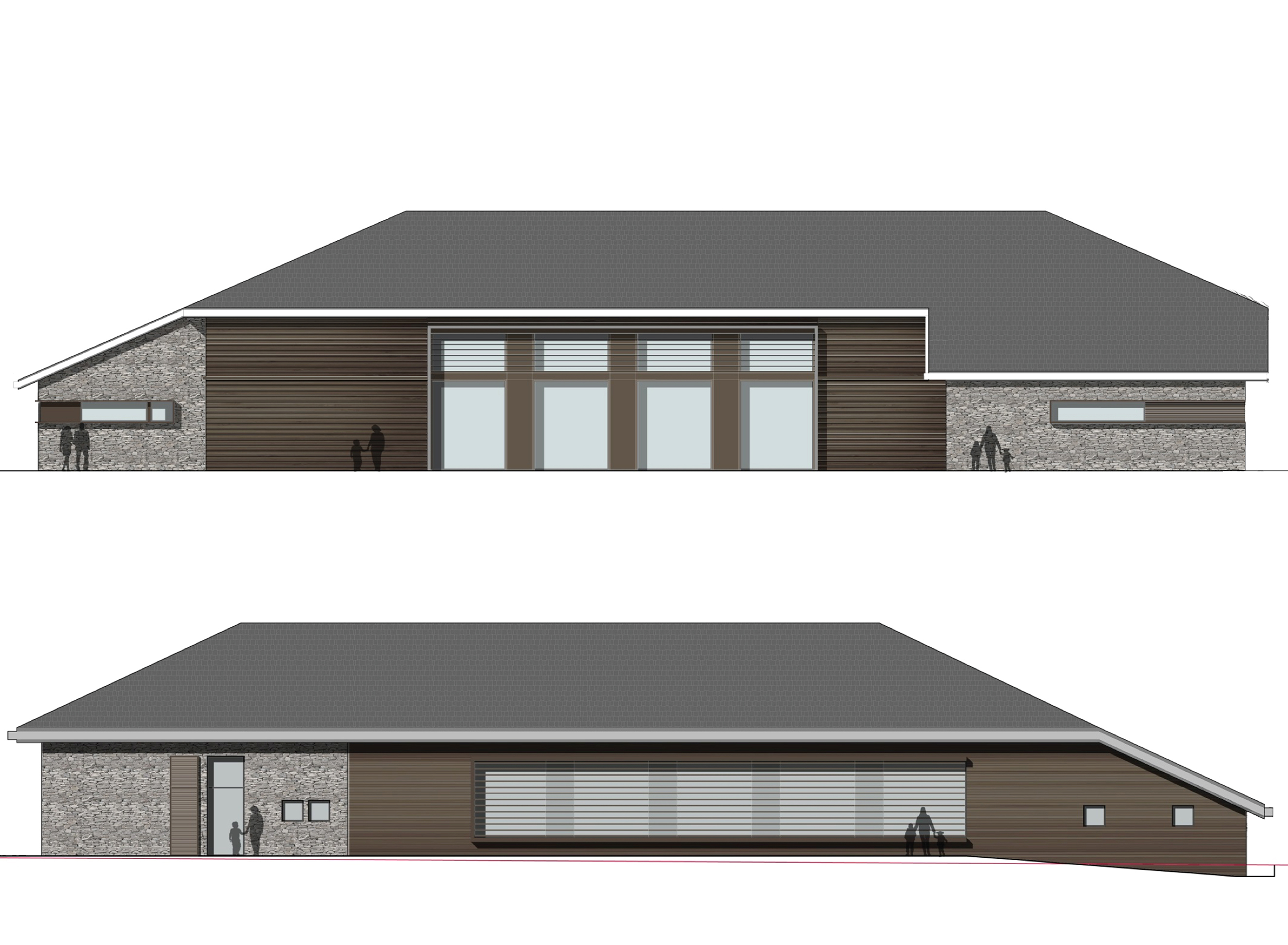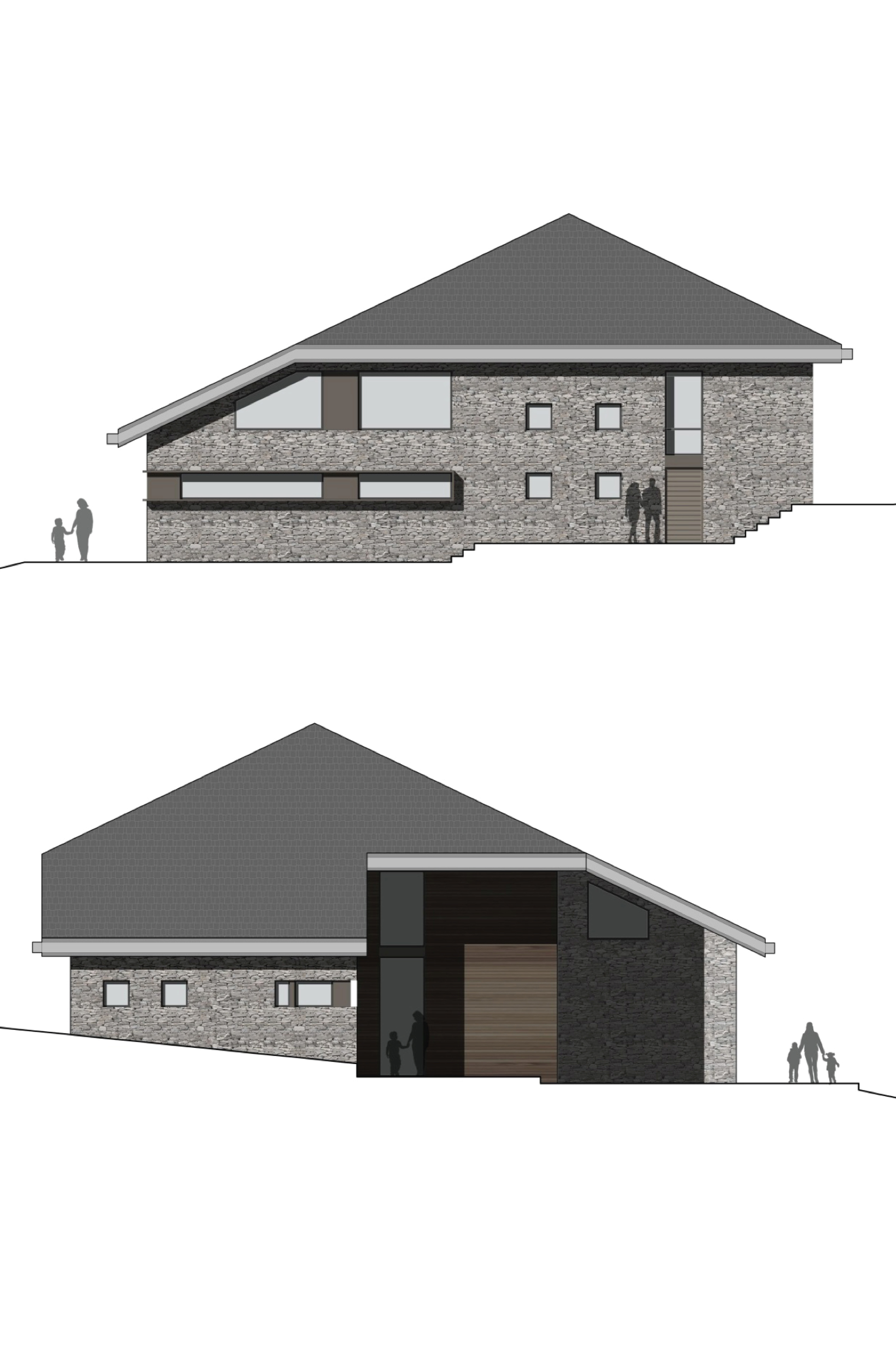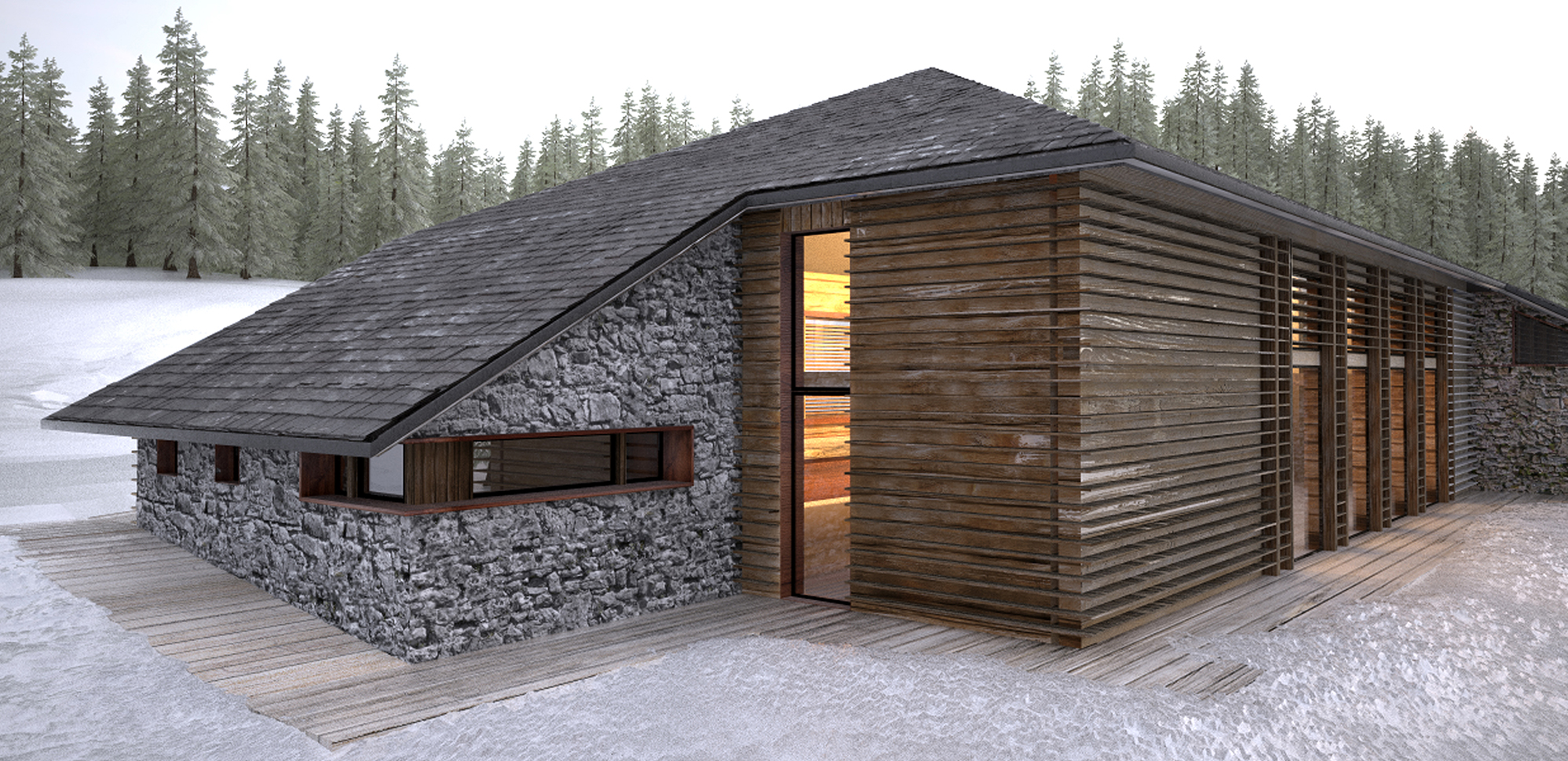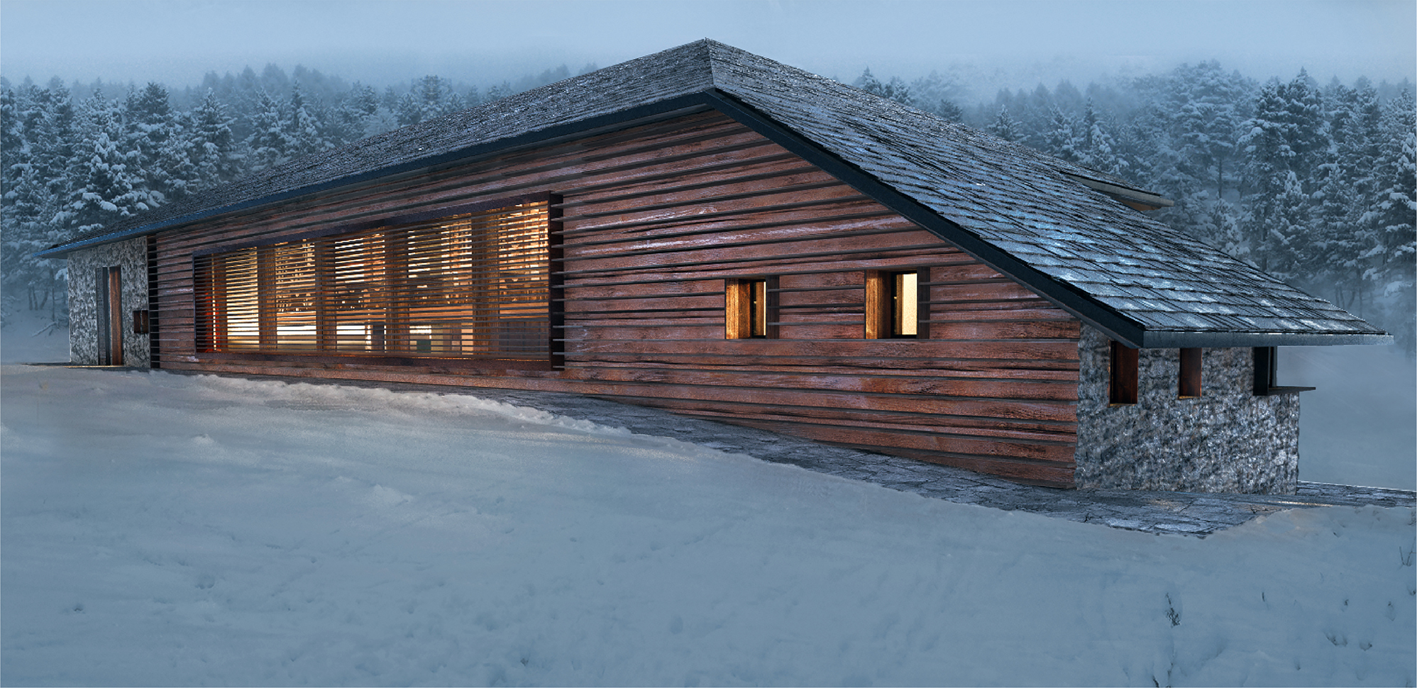 Reconstruction and redevelopment project of the mountain cottage in Campo Carlo Magno, used as accommodation and connected with the existing Golf Hotel structure. The design composition of the façade is characterized by succession of volumes covered by recycled stone and wood. The wooden boards are laid with an alternate texture, inspired by the modernistic walls and the horizontal textures of the blockbau structures. The main façade composition is characterized by the alternation between wooden-framed full height openings and vertical partitions, in order to recall the buttresses of the original construction.