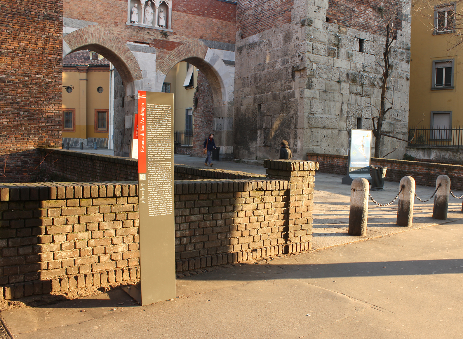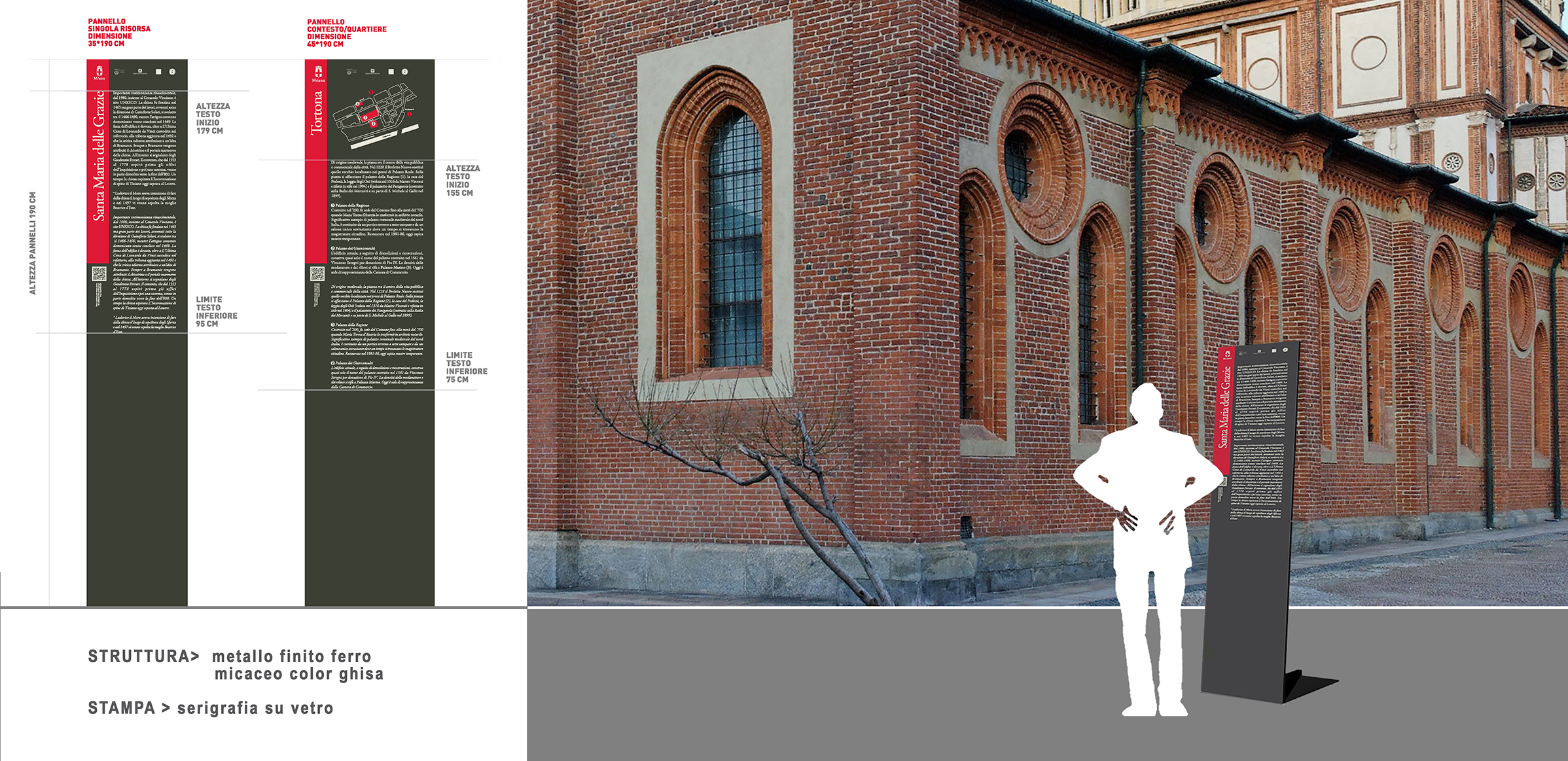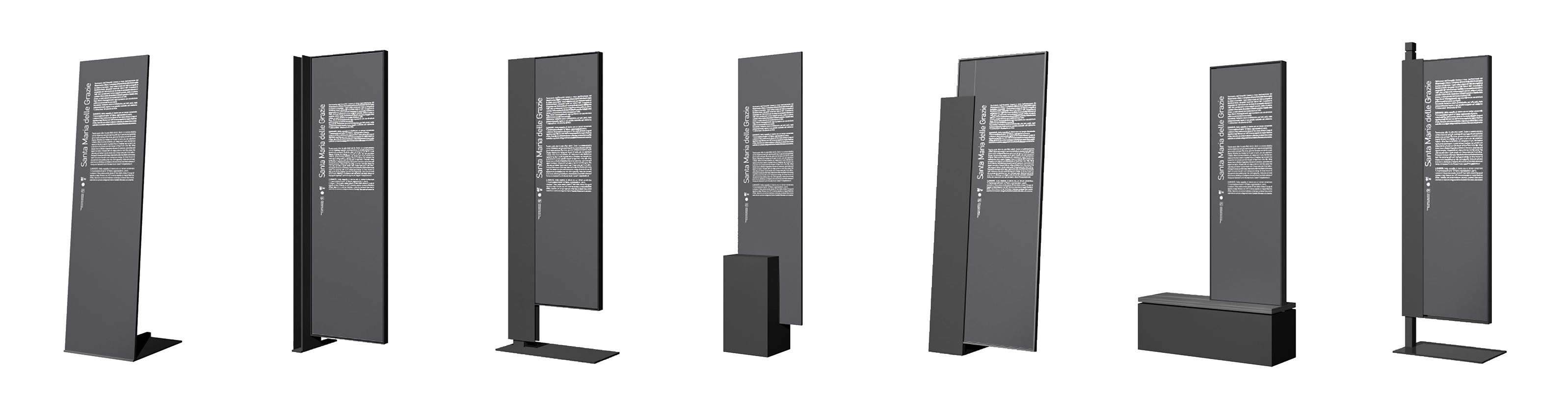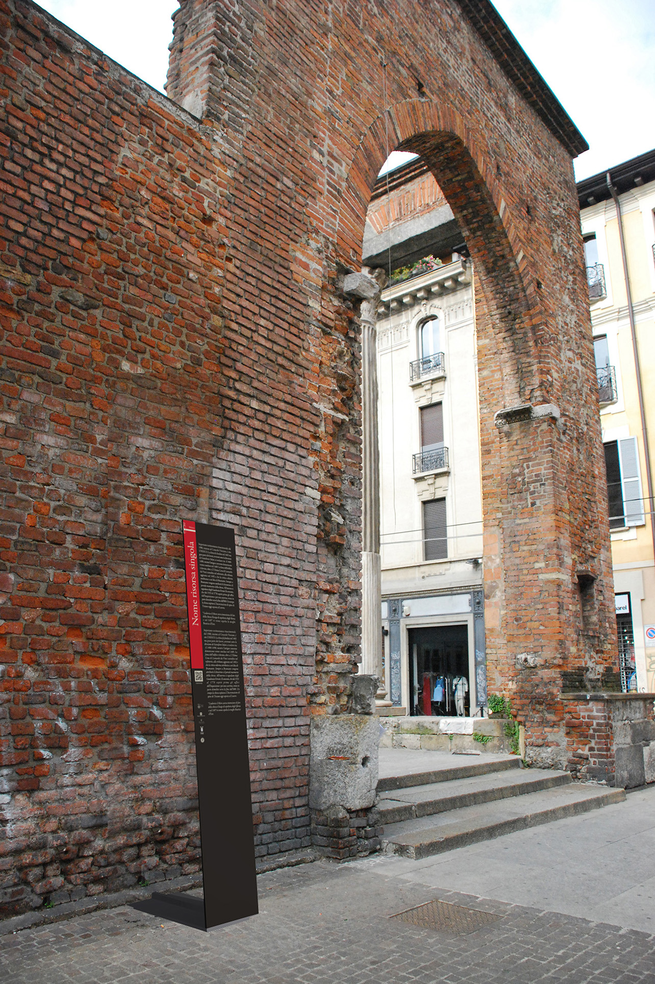 La nuova segnaletica info-monumentale commissionata dal Comune di Milano, in un progetto di promozione turistica monumentale, è costituita da una serie di totem autoportanti, frutto di un processo di semplificazione formale, ciascuno dedicato a un edificio o a un insieme urbano di rilevanza artistico-monumentale. Il Totem, costituito da una lastra monomaterica in ferro zincato piegata e lievemente inclinata, è frutto di un processo di semplificazione formale partito dall'osservazione degli elementi di arredo urbano già presenti nella tradizione milanese e con cui si è voluta mantenere la coerenza attraverso la scelta cromatica. La grafica recupera infatti la fascia rossa, caratteristica principale del brand Milano, e lo rende elemento distintivo della nuova segnaletica turistica, garantendo grande visibilità e riconoscibilità ai singoli pannelli. La scelta del carattere tipografico, la dimensione e il colore del testo rispettano le esigenze di leggibilità e accessibilità mantendendo nel contempo un evidente legame con la tradizione editoriale mentre il design delle mappe è semplice e intuitivo, con chiare indicazioni rispetto alla posizione dell'osservatore ed evidenti riferimenti alle risorse illustrate nel testo.