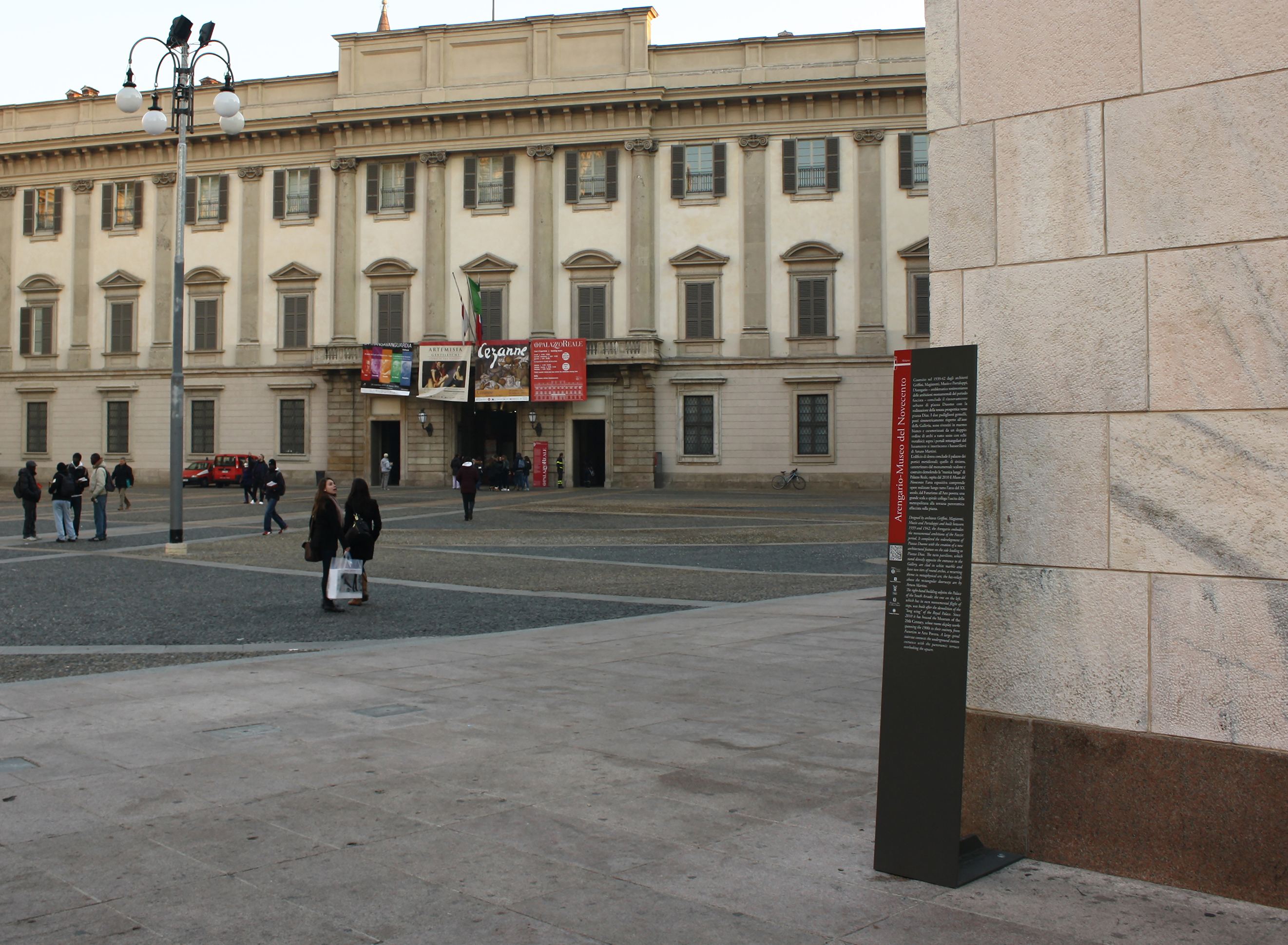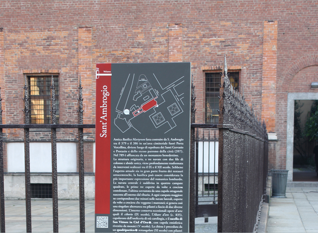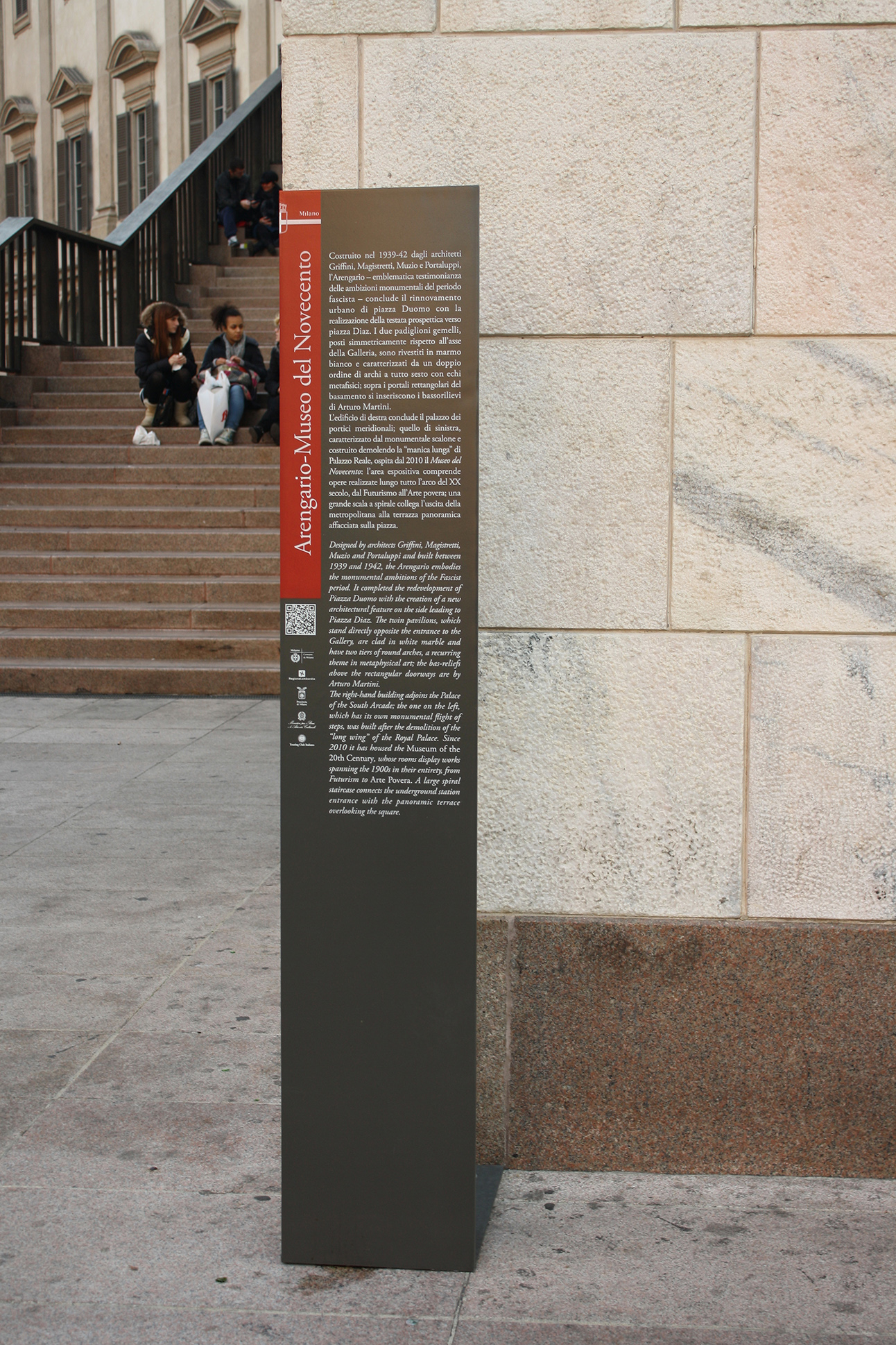 The new info-monumental sign system was commissioned by the Municipality of Milan as part of a plan to promote tourism, and consists of a set of self-standing totems, (made up of a single slab of galvanized iron, slightly folded to an angle), the result of a long simplification process and is dedicated to a single relevant building or urban area. Each info-totem is made up of a single slab of galvanized iron, slightly folded to an angle, and is the result of a long simplification process, which has taken into account the vast number and typology of existing signs and objects already present in town in a chaotic stratified landscape. We decided to maintain a visual and material coherence with the Milanese tradition. The graphic project maintains the red band, main characteristic of the new "Milano brand" and this becomes the most visually significant and recognizable element of the totems. The choice of fonts, size and colour of texts was carefully made to enhance legibility, at the same time keeping a strong tie with editorial tradition, whereas the design of maps is simple and intuitive, with clear indication of the position of the reader, and easy references to text.