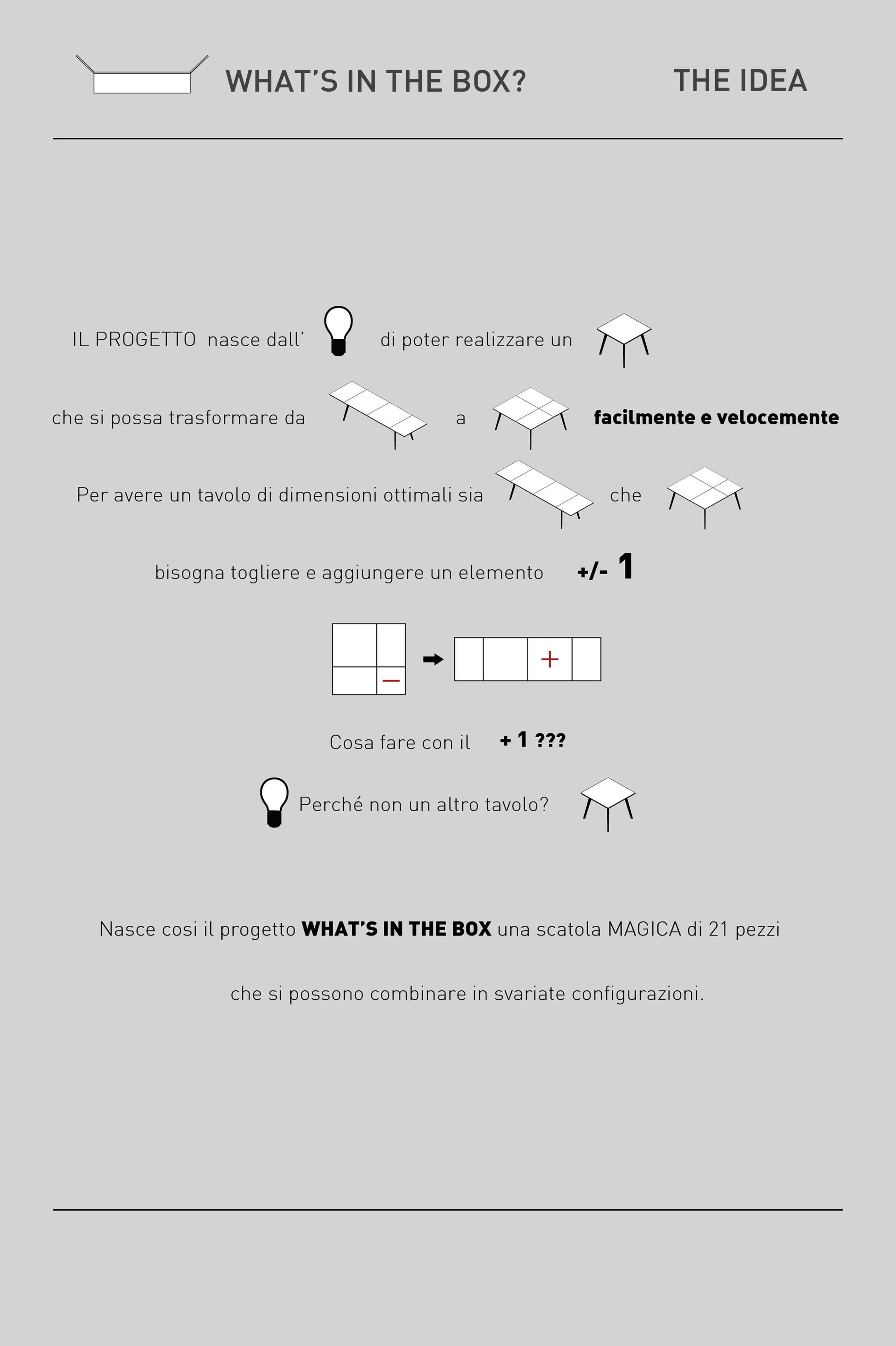 "WHAT’S IN THE BOX" è una scatola magica con 21 elementi che si possono combinare in vari modi per creare un tavolo ed il suo + 1. Mai capitato di organizzare una cena in piedi e di accostare il tavolo alla parete? Di aggiungere una prolunga per la cena di Natale? Di cambiare casa e dover riadeguare gli arredi ai nuovi spazi ?