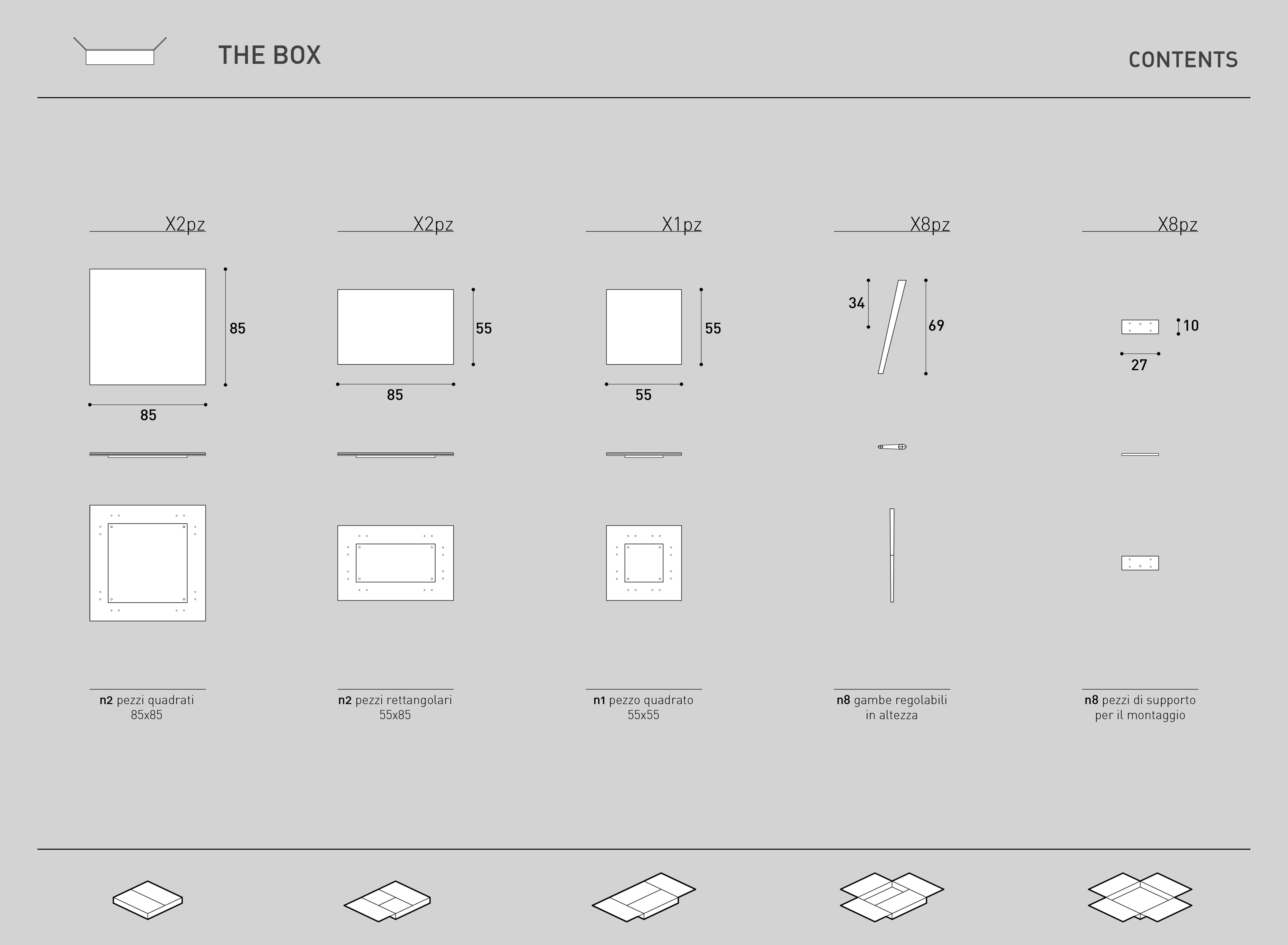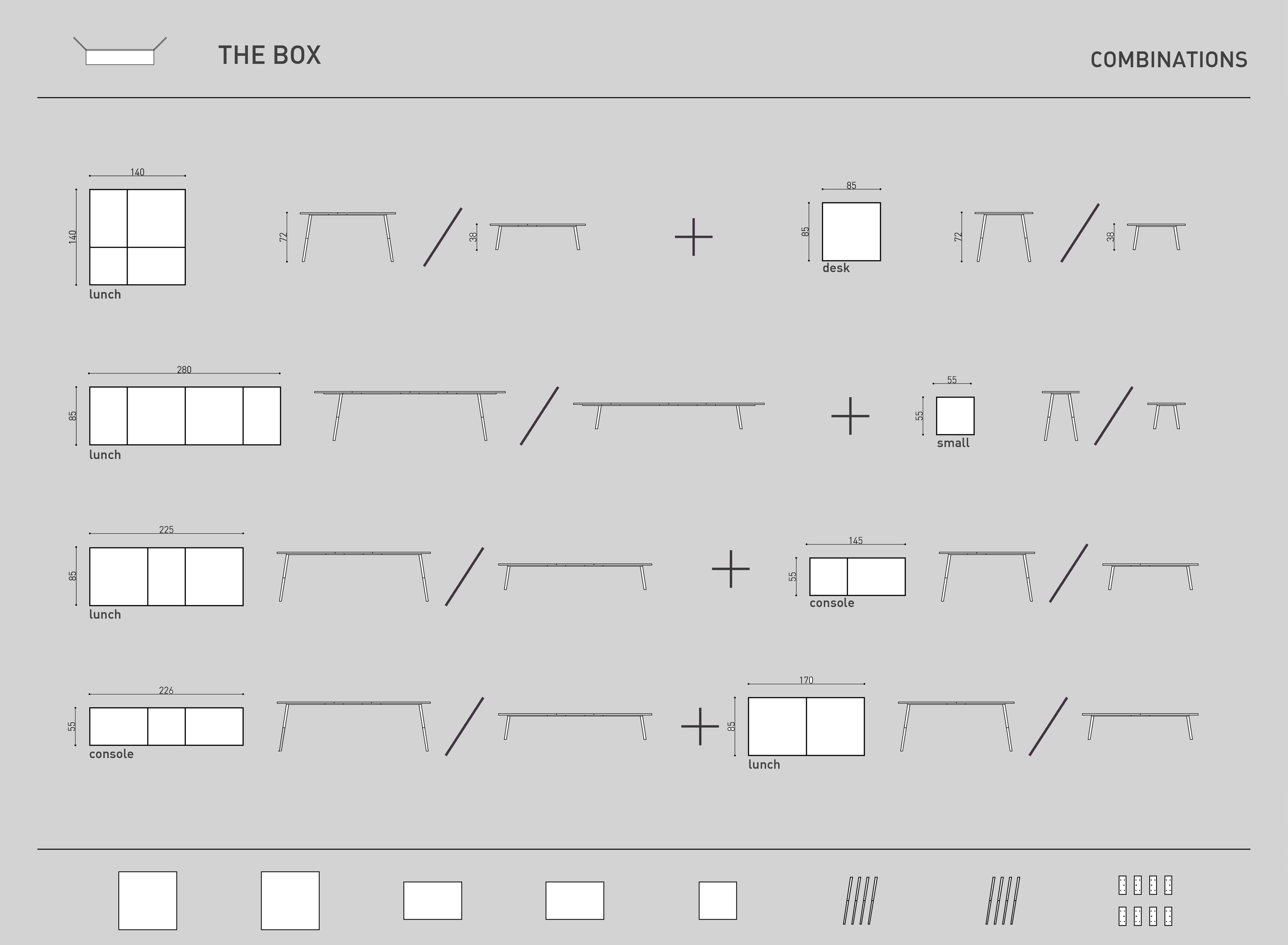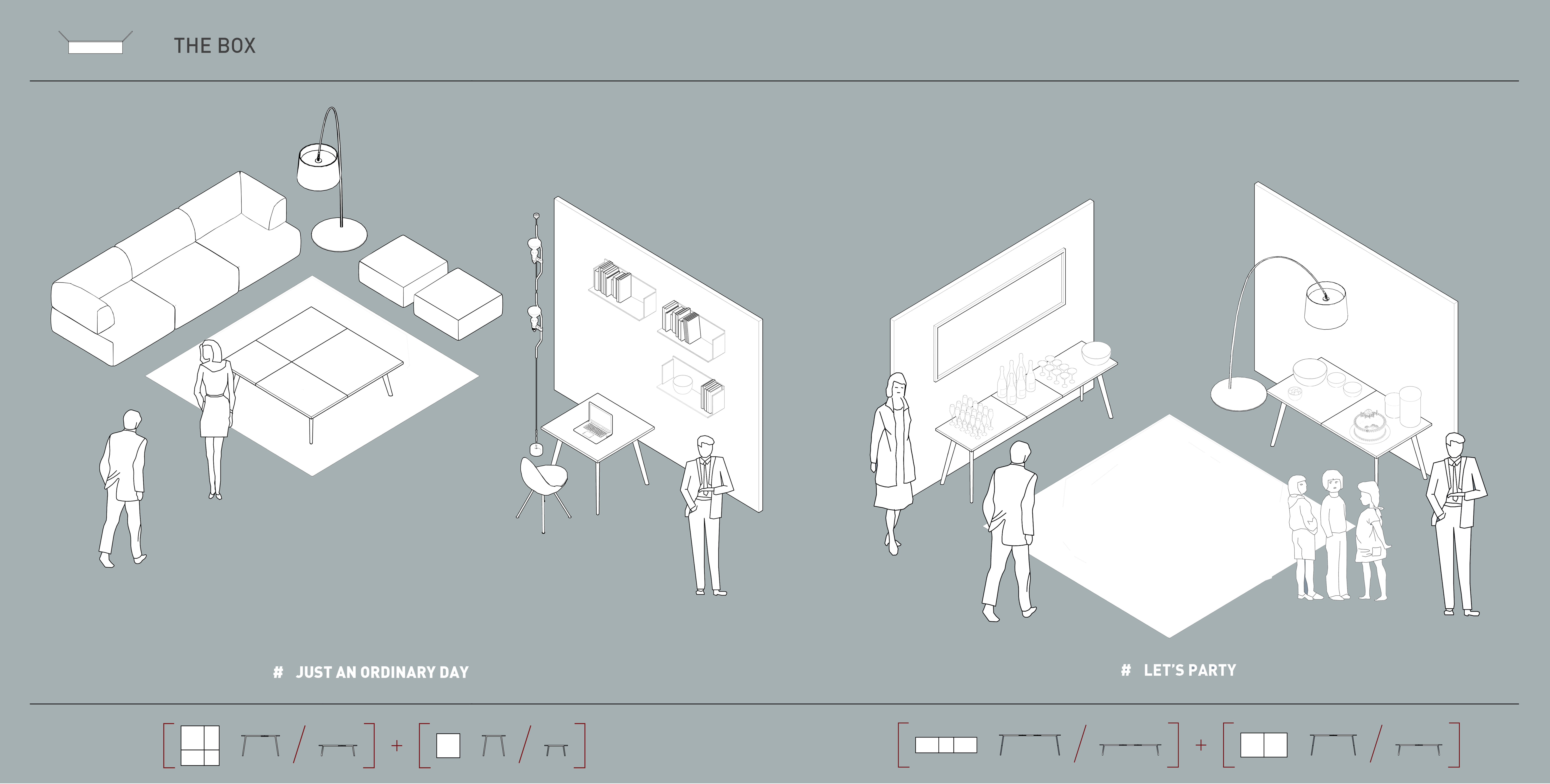 “WHAT’S IN THE BOX” is a magic box composed of 21 elements which may be combined in different layouts in order to create a table and its +1. Have you ever organized a standing-up dinner and put your table against a wall? Or added an extension for Christmas Dinner? Did you ever move into a new home and have to re-adapt the furniture to new spaces?
